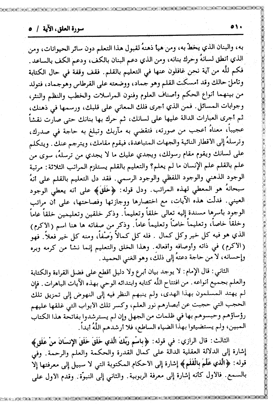 الثاني: قال الإمام: لا يوجد بيان أبرع ولا دليل أقطع على فضل القراءة والكتابة والعلم بجميع أنواعه. من افتتاح الله كتابه وابتدائه الوحي بهذه الآيات الباهرات. فإن لم يهتد المسلمون بهذا الهدى، ولم ينبهم النظر فيه إلى النهوض إلى تمزيق تلك الحجب التي حجبت عن أبصارهم نور العلم، وكسر تلك الأبواب التي غلقها عليهم رؤساؤهم وحبسوهم بها في ظلمات من الجهل وإن لم يسترشدوا بفاتحة هذا الكتاب المبين، ولم يستضيئوا بهذا الضياء الساطع، فلا أرشدهم الله أبدا.