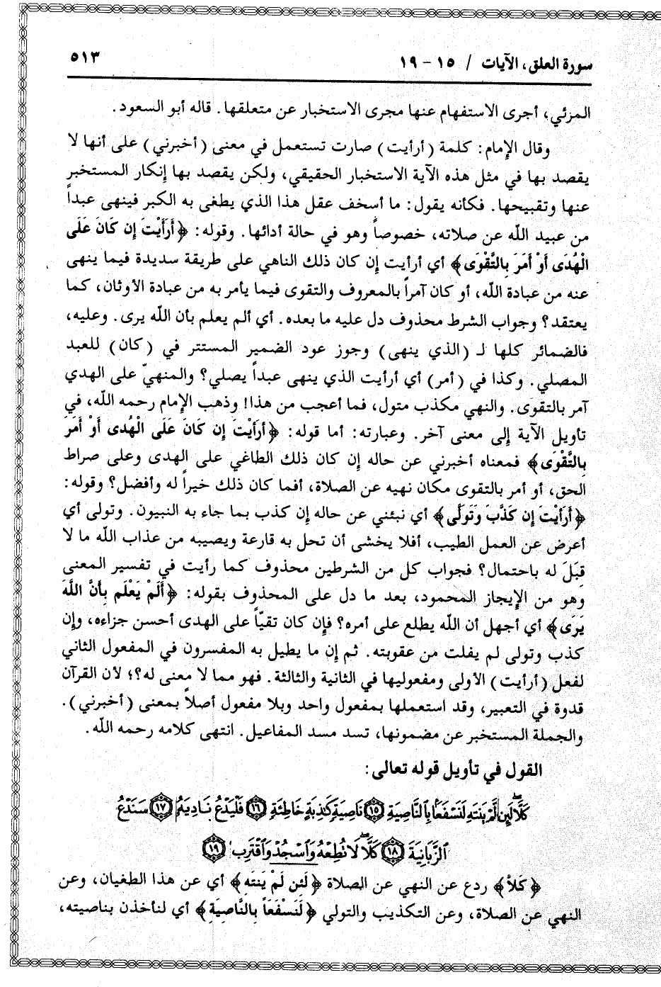 وقال الإمام: كلمة (أرأيت) صارت تستعمل في معنى (أخبرني) على أنها لا يقصد بها في مثل هذه الآية الاستخبار الحقيقي، ولكن يقصد بها إنكار المستخبر عنها وتقبيحها. فكأنه يقول: ما أسخف عقل هذا الذي يطغى به الكبر فينهى عبدا من عبيد الله عن صلاته، خصوصا وهو في حالة أدائها. وقوله: أَرَأَيْتَ إِنْ كانَ عَلَى الْهُدى أَوْ أَمَرَ بِالتَّقْوى أي أرأيت إن كان ذلك الناهي على طريقة سديدة فيما ينهى عنه من عبادة الله، أو كان آمرا بالمعروف والتقوى فيما يأمر به من عبادة الأوثان، كما يعتقد؟ وجواب الشرط محذوف دل عليه ما بعده. أي ألم يعلم بأن الله يرى. وعليه، فالضمائر كلها ل (الذي ينهى) وجوز عود الضمير المستتر في (كان) للعبد المصلي. وكذا في (أمر) أي أرأيت الذي ينهى عبدا يصلي؟ والمنهيّ على الهدي آمر بالتقوى. والنهي مكذب متول، فما أعجب من هذا! وذهب الإمام رحمه الله، في تأويل الآية إلى معنى آخر. وعبارته: أما قوله: أَرَأَيْتَ إِنْ كانَ عَلَى الْهُدى أَوْ أَمَرَ بِالتَّقْوى فمعناه أخبرني عن حاله إن كان ذلك الطاغي على الهدى وعلى صراط الحق، أو أمر بالتقوى مكان نهيه عن الصلاة، أفما كان ذلك خيرا له وأفضل؟ وقوله: