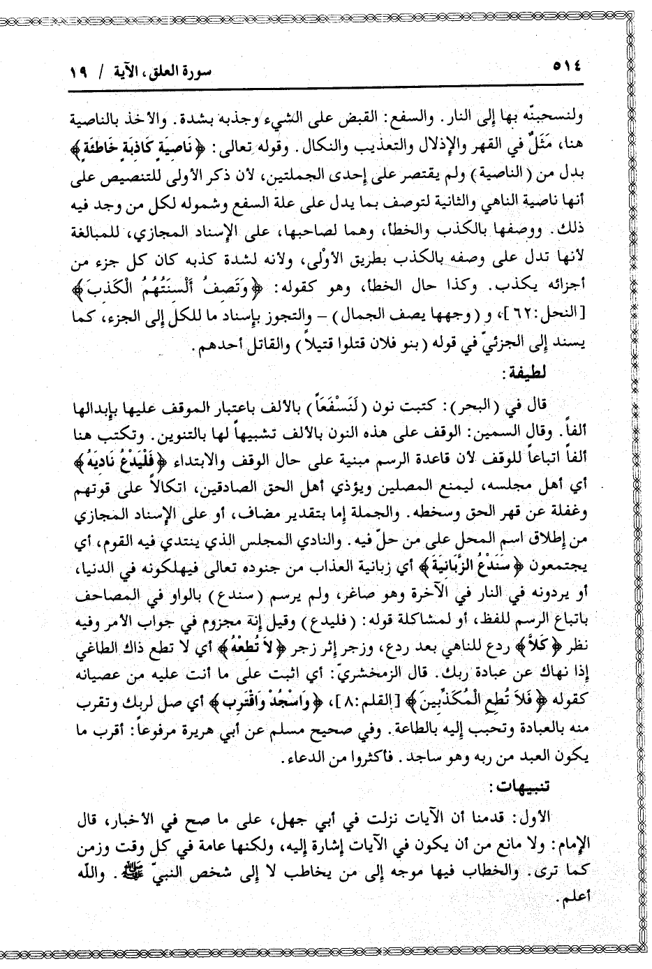 قال في (البحر) : كتبت نون (لنسفعا) بالألف باعتبار الموقف عليها بإبدالها ألفا. وقال السمين: الوقف على هذه النون بالألف تشبيها لها بالتنوين. وتكتب هنا ألفا اتباعا للوقف لأن قاعدة الرسم مبنية على حال الوقف والابتداء فَلْيَدْعُ نادِيَهُ أي أهل مجلسه، ليمنع المصلين ويؤذي أهل الحق الصادقين، اتكالا على قوتهم وغفلة عن قهر الحق وسخطه. والجملة إما بتقدير مضاف، أو على الإسناد المجازي من إطلاق اسم المحل على من حلّ فيه. والنادي المجلس الذي ينتدي فيه القوم، أي يجتمعون سَنَدْعُ الزَّبانِيَةَ أي زبانية العذاب من جنوده تعالى فيهلكونه في الدنيا، أو يردونه في النار في الآخرة وهو صاغر، ولم يرسم (سندع) بالواو في المصاحف باتباع الرسم للفظ، أو لمشاكلة قوله: (فليدع) وقيل إنه مجزوم في جواب الأمر وفيه نظر كَلَّا ردع للناهي بعد ردع، وزجر إثر زجر لا تُطِعْهُ أي لا تطع ذاك الطاغي إذا نهاك عن عبادة ربك. قال الزمخشريّ: أي اثبت على ما أنت عليه من عصيانه كقوله فَلا تُطِعِ الْمُكَذِّبِينَ [القلم: 8] ، وَاسْجُدْ وَاقْتَرِبْ أي صل لربك وتقرب منه بالعبادة وتحبب إليه بالطاعة. وفي صحيح مسلم عن أبي هريرة مرفوعا: أقرب ما يكون العبد من ربه وهو ساجد. فأكثروا من الدعاء.