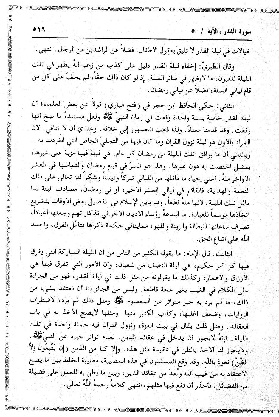 الثاني: حكى الحافظ ابن حجر في (فتح الباري) قولا عن بعض العلماء أن ليلة القدر خاصة بسنة واحدة وقعت في زمان النبيّ صلى الله عليه وسلم ولعل مستنده ما صح أنها رفعت. وقد قدمنا معناه. ولذا ذهب الجمهور إلى خلافه. وعندي أن لا تنافي. لأن المراد بالأول هو ليلة نزول القرآن وما كان فيها من التجلي الخاص التي انفردت به- وبالثاني أن ما يوافق تلك الليلة من رمضان كل عام، هي ليلة فيها مزية على غيرها، بفضل اختصت به دون غيرها. وهذا هو السرّ في قيام رمضان والتماسها في العشر الأواخر منه. أعني إحياء ما ماثلها من الليالي تبركا وتيمنا وشكرا لله تعالى على تلك النعمة والهداية، فالقائم في ليالي العشر الأخير، أو في رمضان، مصادف البتة لما ماثل تلك الليلة. لأنها منه قطعا. وقد باين الإسلام في تفضيل بعض الأوقات بتشريع اتخاذها موسما للعبادة. ما ابتدعه رؤساء الأديان الأخر في تذكاراتهم وجعلها أعيادا، تصرف ساعاتها للبطالة والزينة واللهو، مما ينافي حكمة ذكراها فتأمّل الفرق، واحمد الله على اتباع الحق.