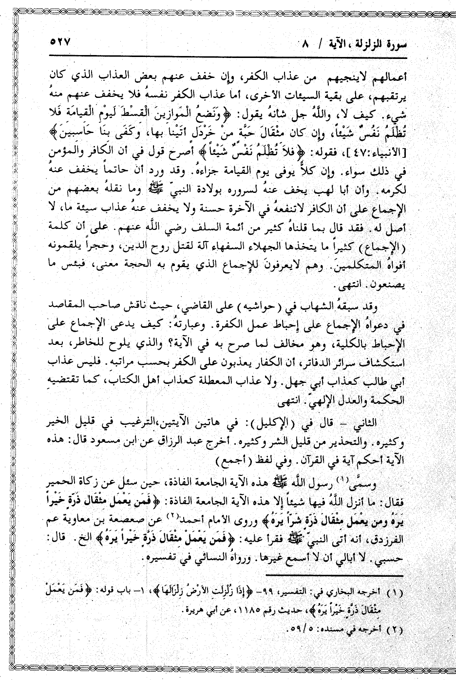 وقد سبقه الشهاب في (حواشيه) على القاضي، حيث ناقش صاحب المقاصد في دعواه الإجماع على إحباط عمل الكفرة. وعبارته: كيف يدعى الإجماع على الإحباط بالكلية، وهو مخالف لما صرح به في الآية؟ والذي يلوح للخاطر، بعد استكشاف سرائر الدفاتر، أن الكفار يعذبون على الكفر بحسب مراتبه. فليس عذاب أبي طالب كعذاب أبي جهل. ولا عذاب المعطلة كعذاب أهل الكتاب، كما تقتضيه الحكمة والعدل الإلهيّ. انتهى الثاني- قال في (الإكليل) : في هاتين الآيتين، الترغيب في قليل الخير وكثيره. والتحذير من قليل الشر وكثيره. أخرج عبد الرزاق عن ابن مسعود قال: هذه الآية أحكم آية في القرآن. وفي لفظ (أجمع) وسمّى «1» رسول الله صلى الله عليه وسلم هذه الآية الجامعة الفاذة، حين سئل عن زكاة الحمير