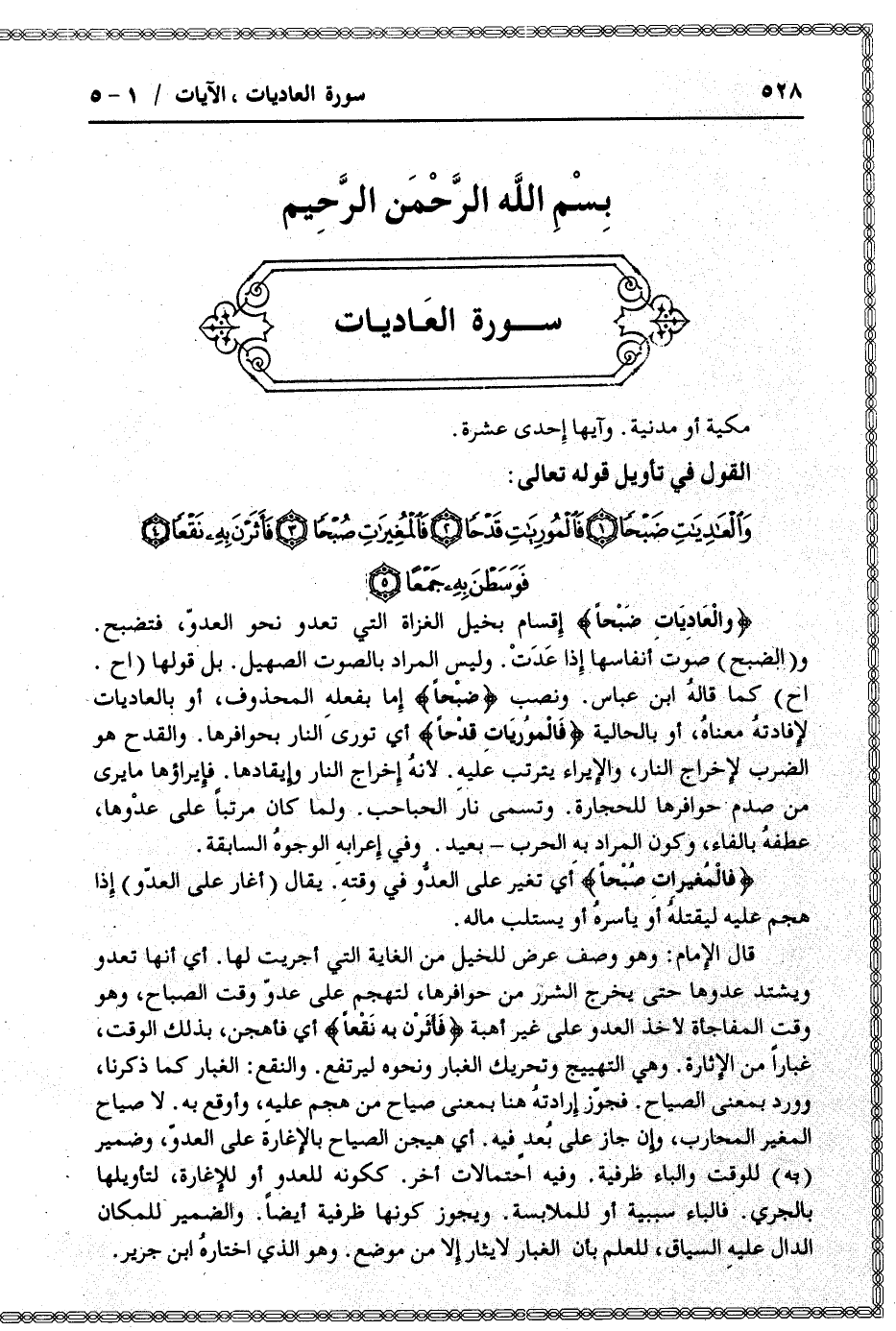 وَالْعادِياتِ ضَبْحاً (1) فَالْمُورِياتِ قَدْحاً (2) فَالْمُغِيراتِ صُبْحاً (3) فَأَثَرْنَ بِهِ نَقْعاً (4)