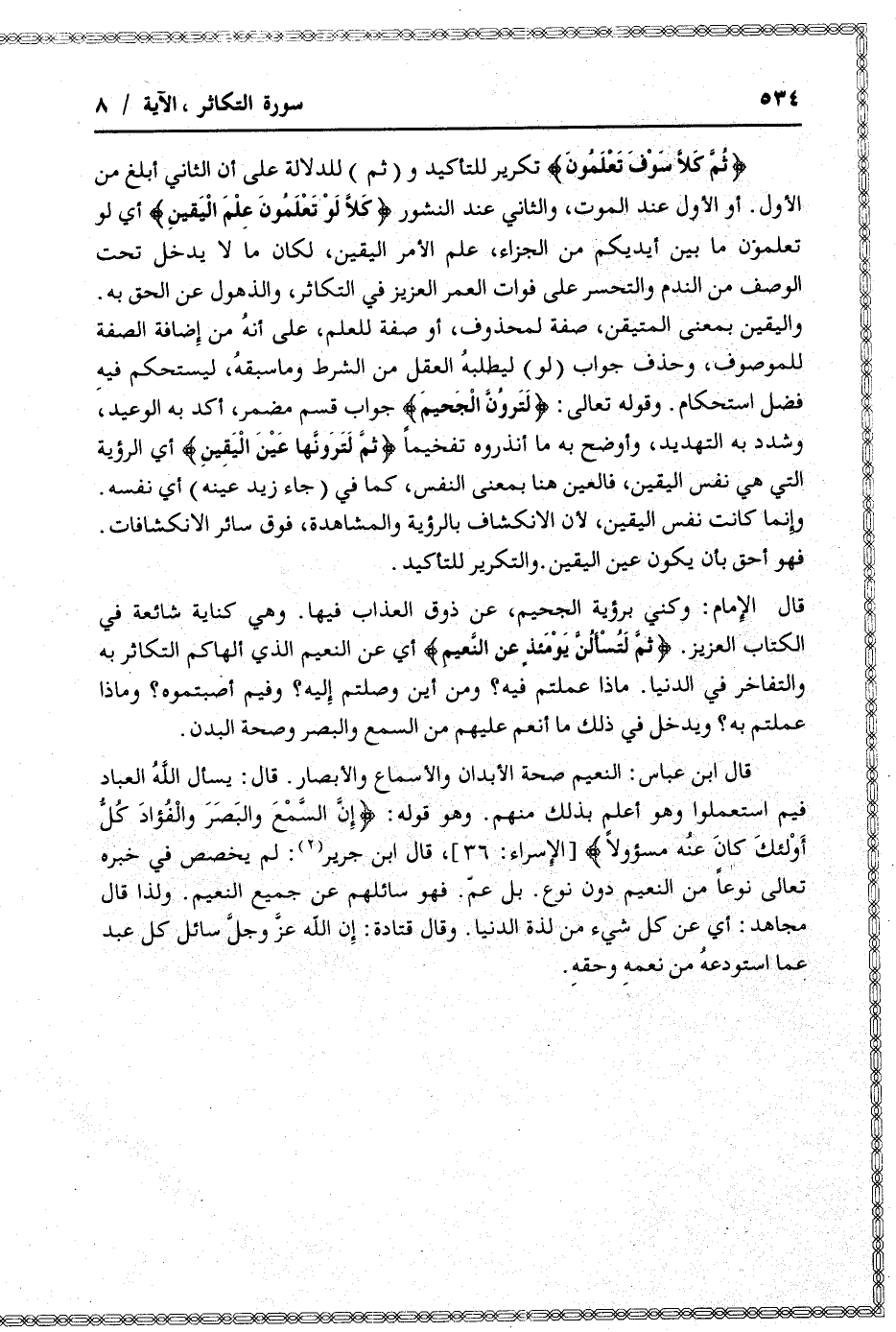 قال الإمام: وكني برؤية الجحيم، عن ذوق العذاب فيها. وهي كناية شائعة في الكتاب العزيز. ثُمَّ لَتُسْئَلُنَّ يَوْمَئِذٍ عَنِ النَّعِيمِ أي عن النعيم الذي ألهاكم التكاثر به والتفاخر في الدنيا. ماذا عملتم فيه؟ ومن أين وصلتم إليه؟ وفيم أصبتموه؟ وماذا عملتم به؟ ويدخل في ذلك ما أنعم عليهم من السمع والبصر وصحة البدن.