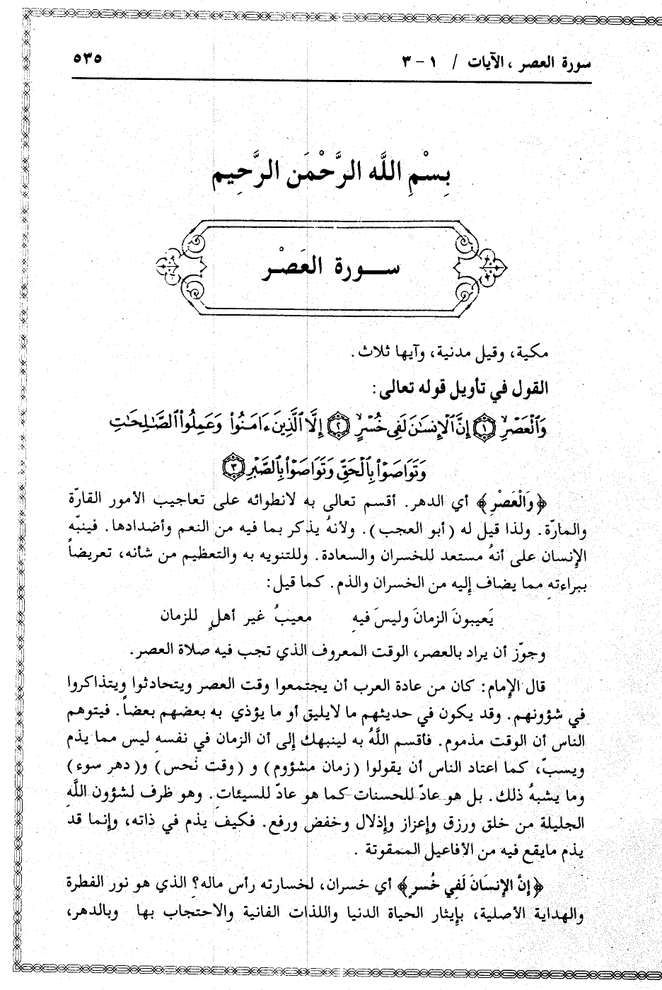 وَالْعَصْرِ (1) إِنَّ الْإِنْسانَ لَفِي خُسْرٍ (2) إِلاَّ الَّذِينَ آمَنُوا وَعَمِلُوا الصَّالِحاتِ وَتَواصَوْا بِالْحَقِّ وَتَواصَوْا بِالصَّبْرِ (3)