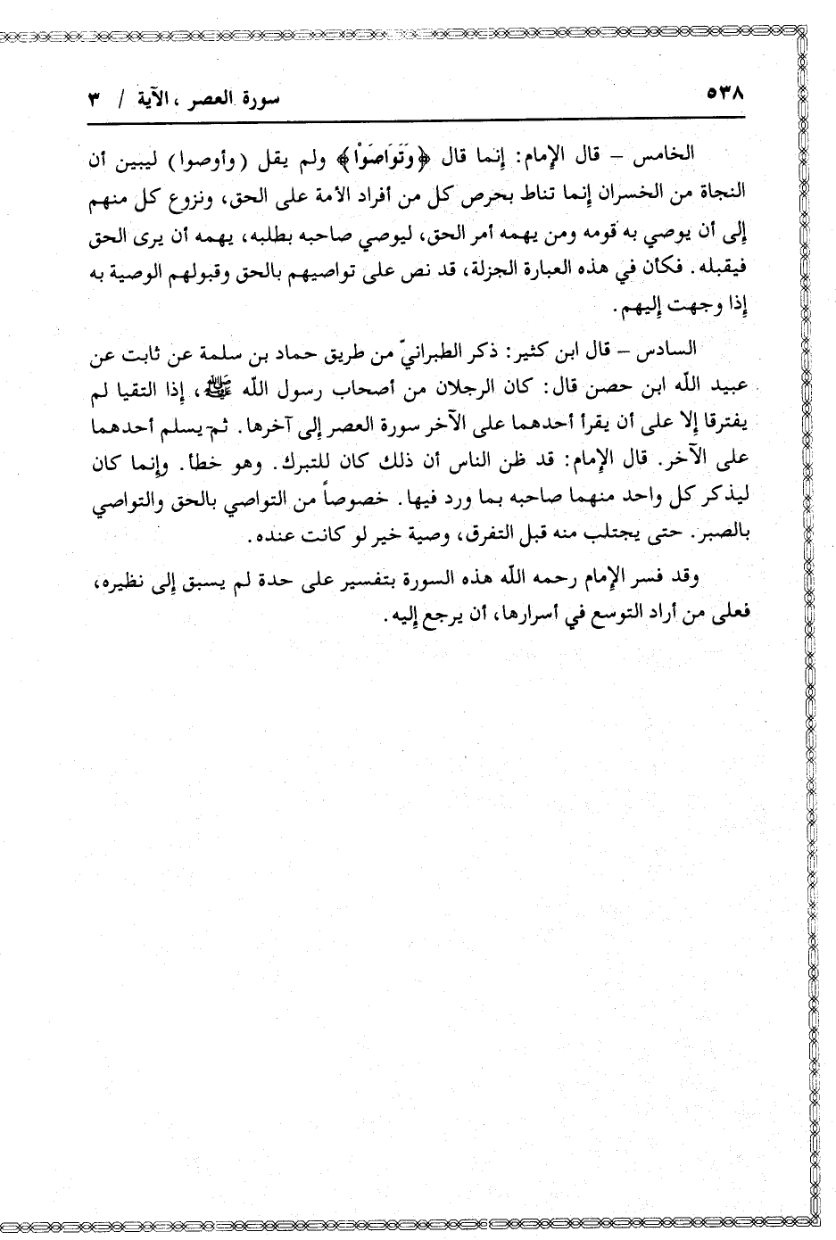 السادس- قال ابن كثير: ذكر الطبرانيّ من طريق حماد بن سلمة عن ثابت عن عبيد الله ابن حصن قال: كان الرجلان من أصحاب رسول الله صلى الله عليه وسلم، إذا التقيا لم يفترقا إلا على أن يقرأ أحدهما على الآخر سورة العصر إلى آخرها. ثم يسلم أحدهما على الآخر. قال الإمام: قد ظن الناس أن ذلك كان للتبرك. وهو خطأ. وإنما كان ليذكر كل واحد منهما صاحبه بما ورد فيها. خصوصا من التواصي بالحق والتواصي بالصبر. حتى يجتلب منه قبل التفرق، وصية خير لو كانت عنده.