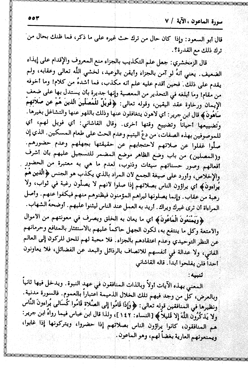 وتضييعها أحيانا وتضييع وقتها أخرى. وقال القاشاني: أي فويل لهم، أي للموصوفين بهذه الصفات، من دعّ اليتيم وعدم الحث على طعام المسكين. الذي إن صلّوا غفلوا عن صلاتهم لاحتجابهم عن حقيقتها بجهلهم وعدم حضورهم.