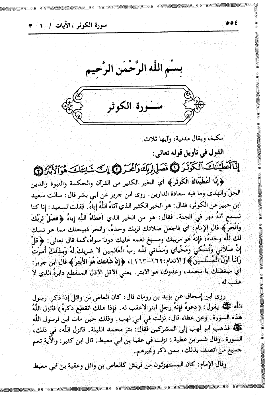 إِنَّا أَعْطَيْناكَ الْكَوْثَرَ أي الخير الكثير من القرآن والحكمة والنبوة والدين الحقّ والهدى وما فيه سعادة الدارين. روى ابن جرير عن أبي بشر قال: سألت سعيد ابن جبير عن الكوثر، فقال: هو الخير الكثير الذي آتاه الله إياه. فقلت لسعيد: إنا كنا نسمع أنه نهر في الجنة. فقال: هو من الخير الذي أعطاه الله إياه فَصَلِّ لِرَبِّكَ وَانْحَرْ قال الإمام: أي فاجعل صلاتك لربك وحده، وانحر ذبيحتك مما هو نسك لك لله وحده، فإنه هو مربيك ومسبغ نعمه عليك دون سواه، كما قال تعالى: قُلْ إِنَّ صَلاتِي وَنُسُكِي وَمَحْيايَ وَمَماتِي لِلَّهِ رَبِّ الْعالَمِينَ لا شَرِيكَ لَهُ وَبِذلِكَ أُمِرْتُ وَأَنَا أَوَّلُ الْمُسْلِمِينَ [الأنعام: 162- 163] ، إِنَّ شانِئَكَ هُوَ الْأَبْتَرُ قال ابن جرير: