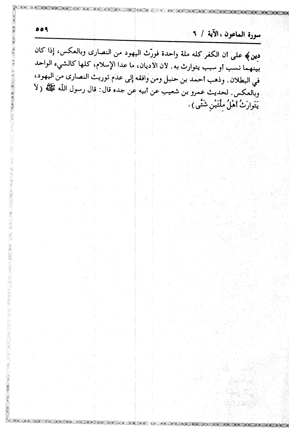 على أن الكفر كله ملة واحدة فورّث اليهود من النصارى وبالعكس، إذا كان بينهما نسب أو سبب يتوارث به. لأن الأديان، ما عدا الإسلام، كلها كالشيء الواحد في البطلان. وذهب أحمد بن حنبل ومن وافقه إلى عدم توريث النصارى من اليهود، وبالعكس.