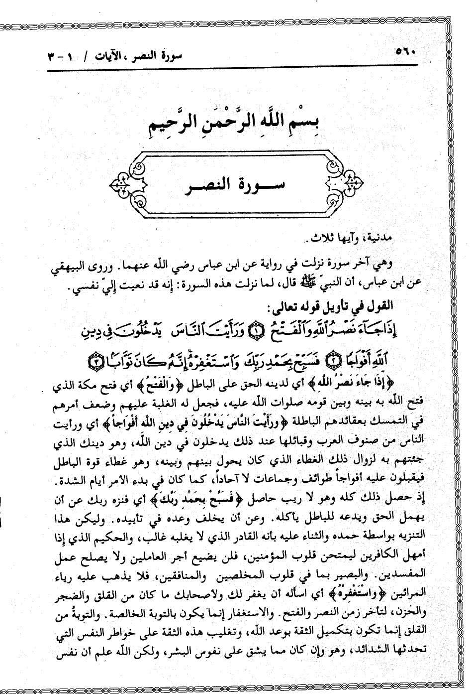 إِذا جاءَ نَصْرُ اللَّهِ وَالْفَتْحُ (1) وَرَأَيْتَ النَّاسَ يَدْخُلُونَ فِي دِينِ اللَّهِ أَفْواجاً (2) فَسَبِّحْ بِحَمْدِ رَبِّكَ وَاسْتَغْفِرْهُ إِنَّهُ كانَ تَوَّاباً (3)