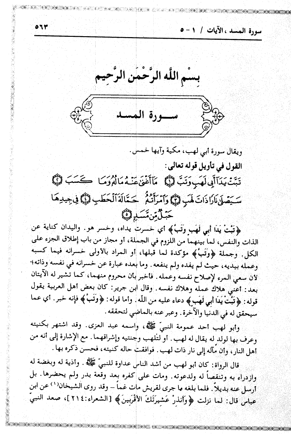 تَبَّتْ يَدا أَبِي لَهَبٍ وَتَبَّ (1) ما أَغْنى عَنْهُ مالُهُ وَما كَسَبَ (2) سَيَصْلى ناراً ذاتَ لَهَبٍ (3) وَامْرَأَتُهُ حَمَّالَةَ الْحَطَبِ (4)