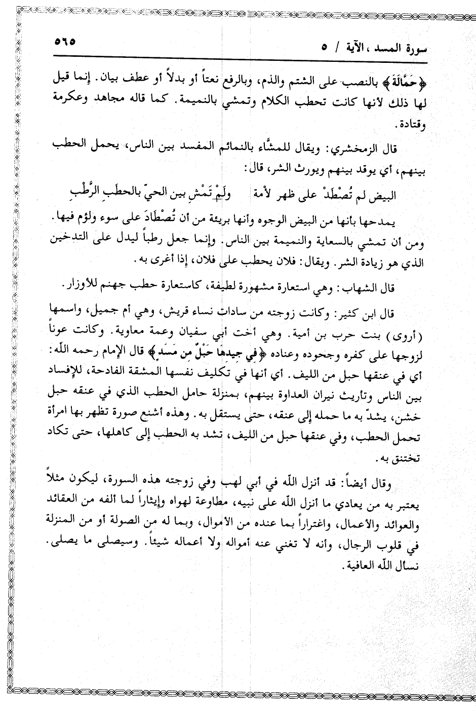 أي في عنقها حبل من الليف. أي أنها في تكليف نفسها المشقة الفادحة، للإفساد بين الناس وتأريث نيران العداوة بينهم، بمنزلة حامل الحطب الذي في عنقه حبل خشن، يشدّ به ما حمله إلى عنقه، حتى يستقل به. وهذه أشنع صورة تظهر بها امرأة تحمل الحطب، وفي عنقها حبل من الليف، تشد به الحطب إلى كاهلها، حتى تكاد تختنق به.