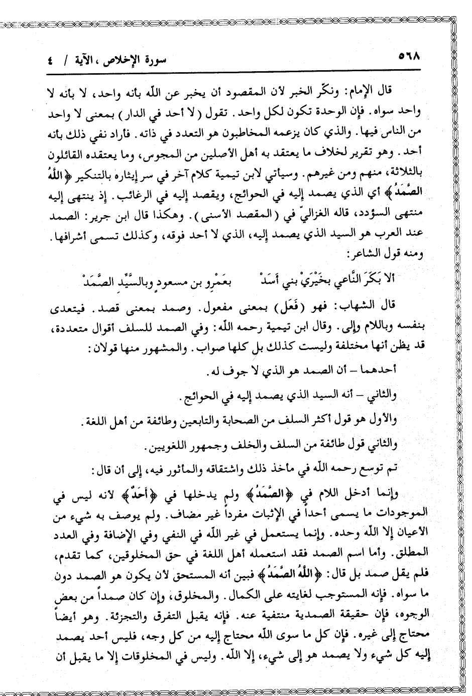 وإنما أدخل اللام في الصَّمَدُ ولم يدخلها في أَحَدٌ لأنه ليس في الموجودات ما يسمى أحدا في الإثبات مفردا غير مضاف. ولم يوصف به شيء من الأعيان إلا الله وحده. وإنما يستعمل في غير الله في النفي وفي الإضافة وفي العدد المطلق. وأما اسم الصمد فقد استعمله أهل اللغة في حق المخلوقين، كما تقدم، فلم يقل صمد بل قال: اللَّهُ الصَّمَدُ فبين أنه المستحق لأن يكون هو الصمد دون ما سواه. فإنه المستوجب لغايته على الكمال. والمخلوق، وإن كان صمدا من بعض الوجوه، فإن حقيقة الصمدية منتفية عنه. فإنه يقبل التفرق والتجزئة. وهو أيضا محتاج إلى غيره. فإن كل ما سوى الله محتاج إليه من كل وجه، فليس أحد يصمد إليه كل شيء ولا يصمد هو إلى شيء، إلا الله. وليس في المخلوقات إلا ما يقبل أن