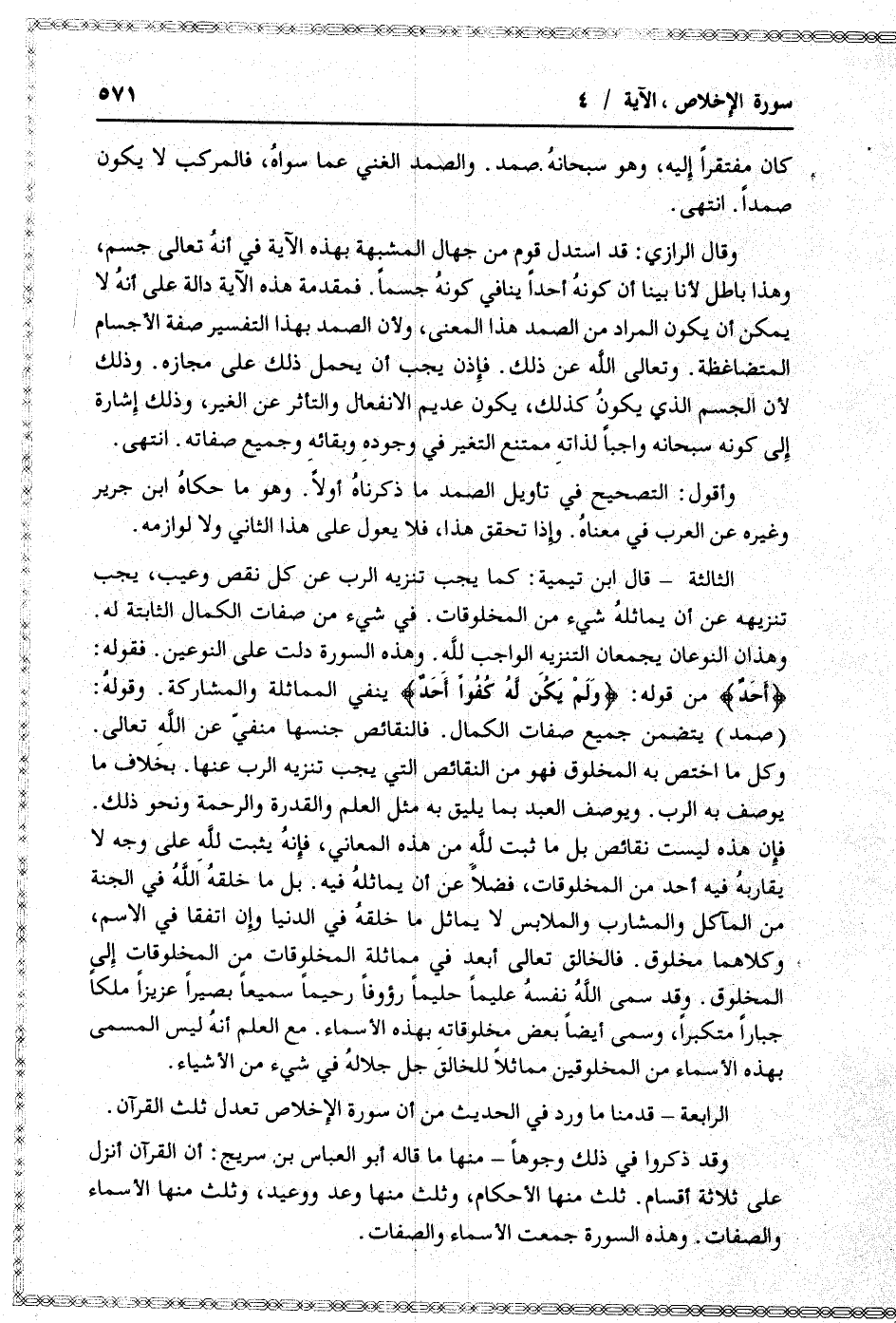 وقال الرازي: قد استدل قوم من جهال المشبهة بهذه الآية في أنه تعالى جسم، وهذا باطل لأنا بينا أن كونه أحدا ينافي كونه جسما. فمقدمة هذه الآية دالة على أنه لا يمكن أن يكون المراد من الصمد هذا المعنى، ولأن الصمد بهذا التفسير صفة الأجسام المتضاغطة. وتعالى الله عن ذلك. فإذن يجب أن يحمل ذلك على مجازه. وذلك لأن الجسم الذي يكون كذلك، يكون عديم الانفعال والتأثر عن الغير، وذلك إشارة إلى كونه سبحانه واجبا لذاته ممتنع التغير في وجوده وبقائه وجميع صفاته. انتهى.
