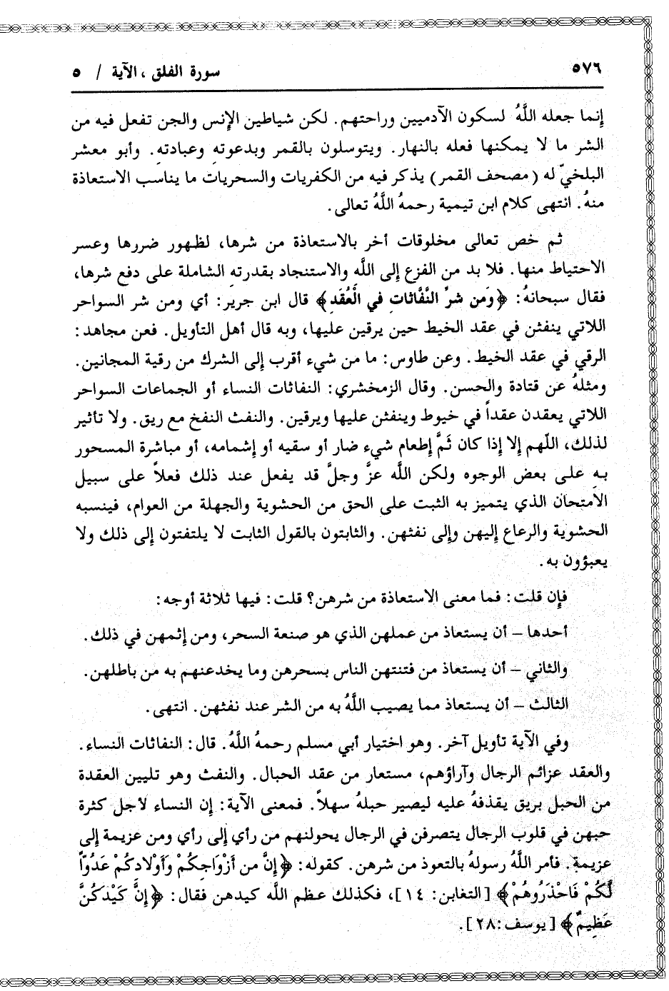 ثم خص تعالى مخلوقات أخر بالاستعاذة من شرها، لظهور ضررها وعسر الاحتياط منها. فلا بد من الفزع إلى الله والاستنجاد بقدرته الشاملة على دفع شرها، فقال سبحانه: وَمِنْ شَرِّ النَّفَّاثاتِ فِي الْعُقَدِ قال ابن جرير: أي ومن شر السواحر اللاتي ينفثن في عقد الخيط حين يرقين عليها، وبه قال أهل التأويل. فعن مجاهد: