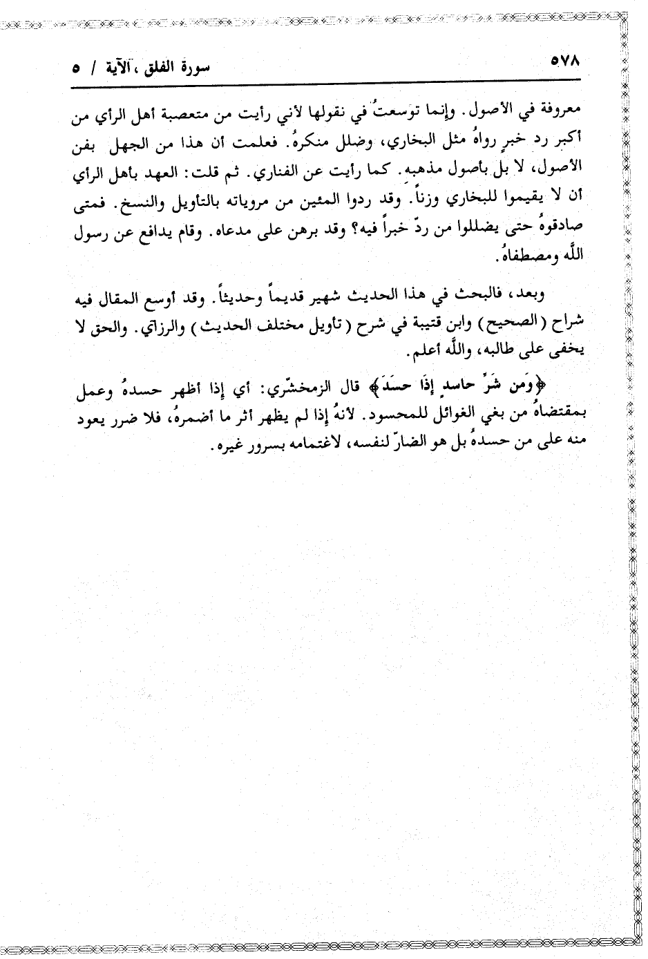 وَمِنْ شَرِّ حاسِدٍ إِذا حَسَدَ قال الزمخشري: أي إذا أظهر حسده وعمل بمقتضاه من بغي الغوائل للمحسود. لأنه إذا لم يظهر أثر ما أضمره، فلا ضرر يعود منه على من حسده بل هو الضارّ لنفسه، لاغتمامه بسرور غيره.