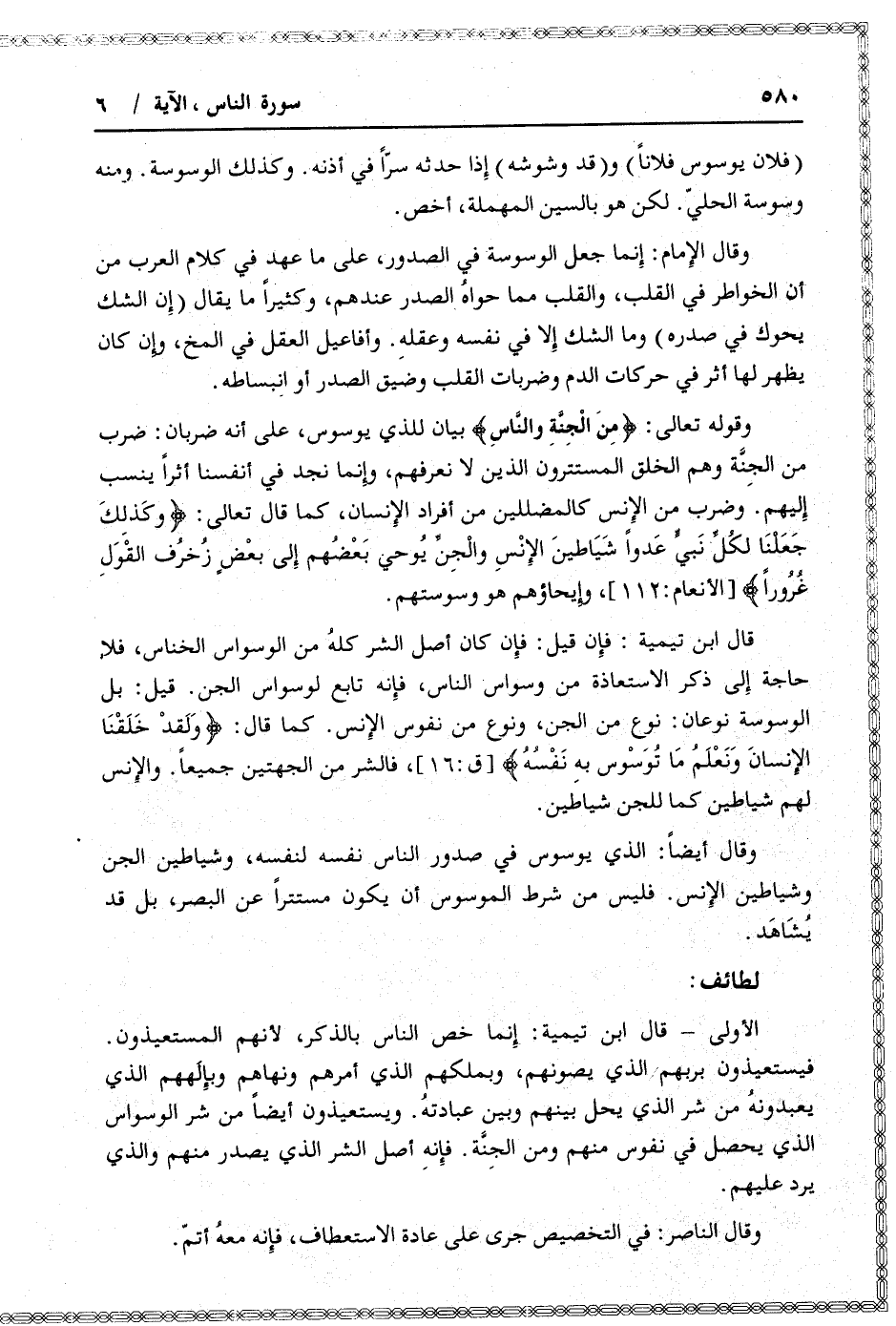 قال ابن تيمية: فإن قيل: فإن كان أصل الشر كله من الوسواس الخناس، فلا حاجة إلى ذكر الاستعاذة من وسواس الناس، فإنه تابع لوسواس الجن. قيل: بل الوسوسة نوعان: نوع من الجن، ونوع من نفوس الإنس. كما قال: وَلَقَدْ خَلَقْنَا الْإِنْسانَ وَنَعْلَمُ ما تُوَسْوِسُ بِهِ نَفْسُهُ [ق: 16] ، فالشر من الجهتين جميعا. والإنس لهم شياطين كما للجن شياطين.