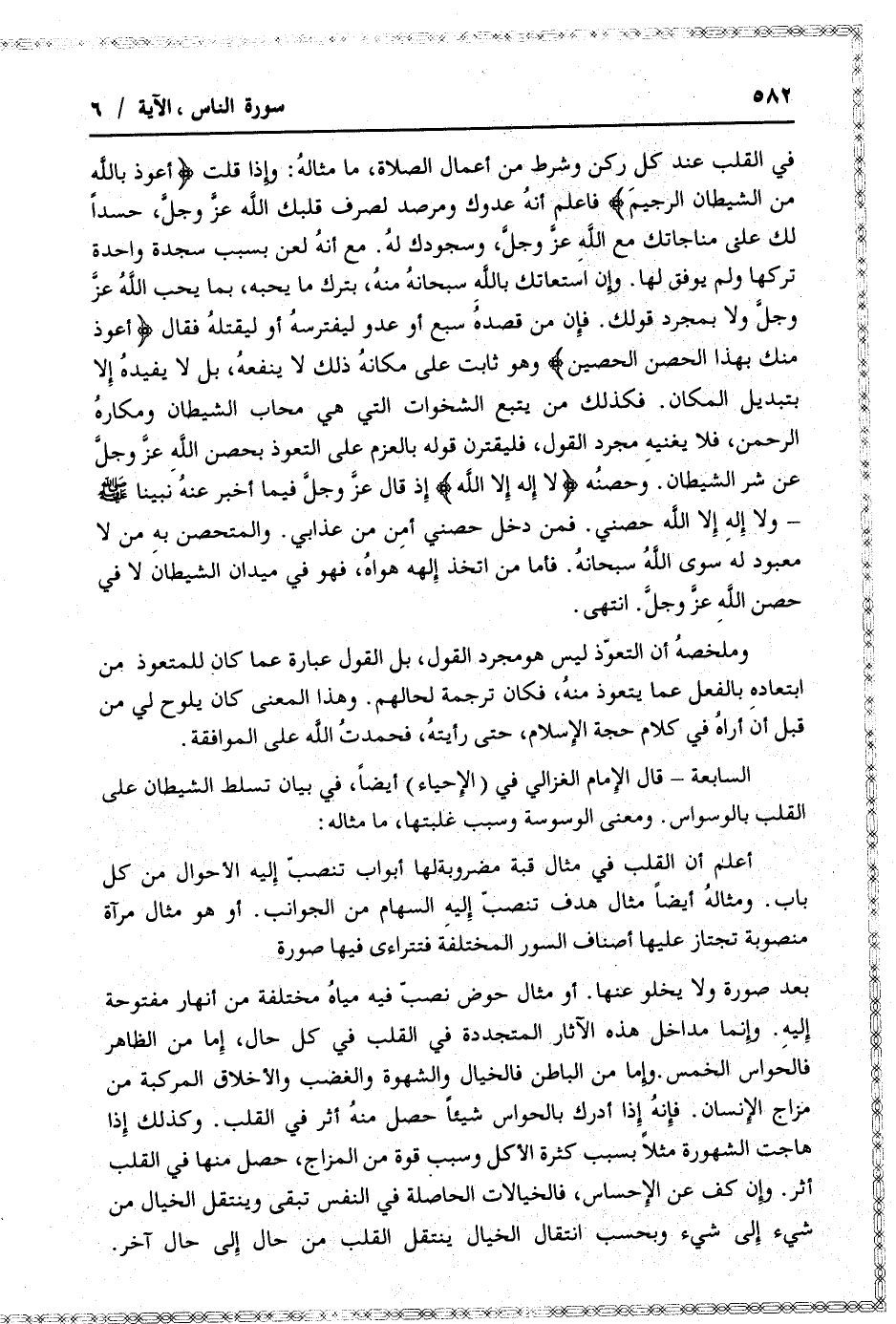 السابعة- قال الإمام الغزالي في (الإحياء) أيضا، في بيان تسلط الشيطان على القلب بالوسواس. ومعنى الوسوسة وسبب غلبتها، ما مثاله: