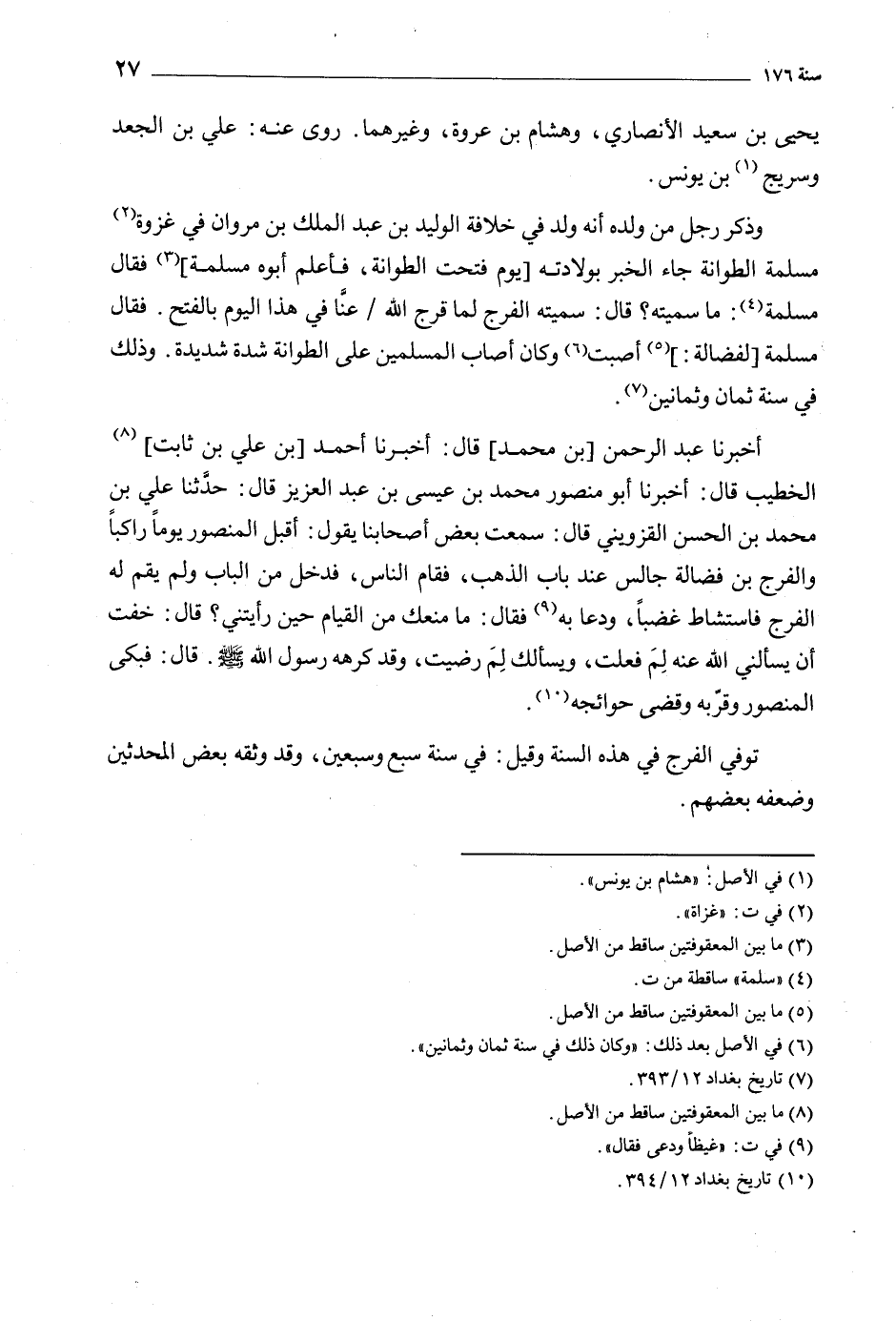 توفي الفرج فِي هَذِهِ السَّنَةِ وَقِيلَ: فِي سَنَةِ سَبْعٍ وسبعين، وقد وثقه بعض المحدثين وضعفه بعضهم.