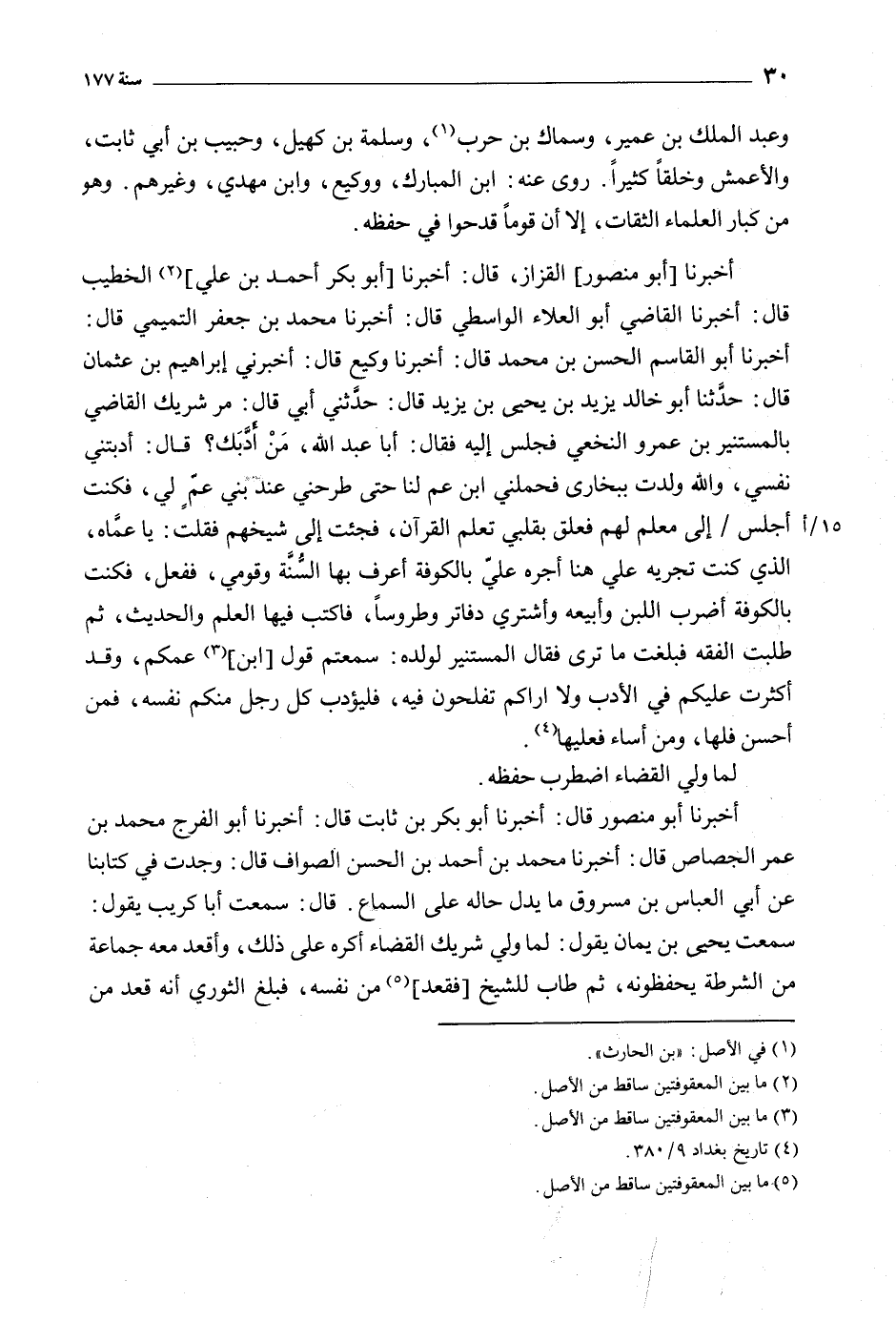 أخبرنا [أبو منصور] القزاز، قَالَ: أخبرنا [أبو بكر أحمد بن علي] [2] الخطيب قَالَ: أَخْبَرَنَا القاضي أَبُو العلاء الواسطي قَالَ: أخبرنا مُحَمَّد بن جعفر التميمي قَالَ: