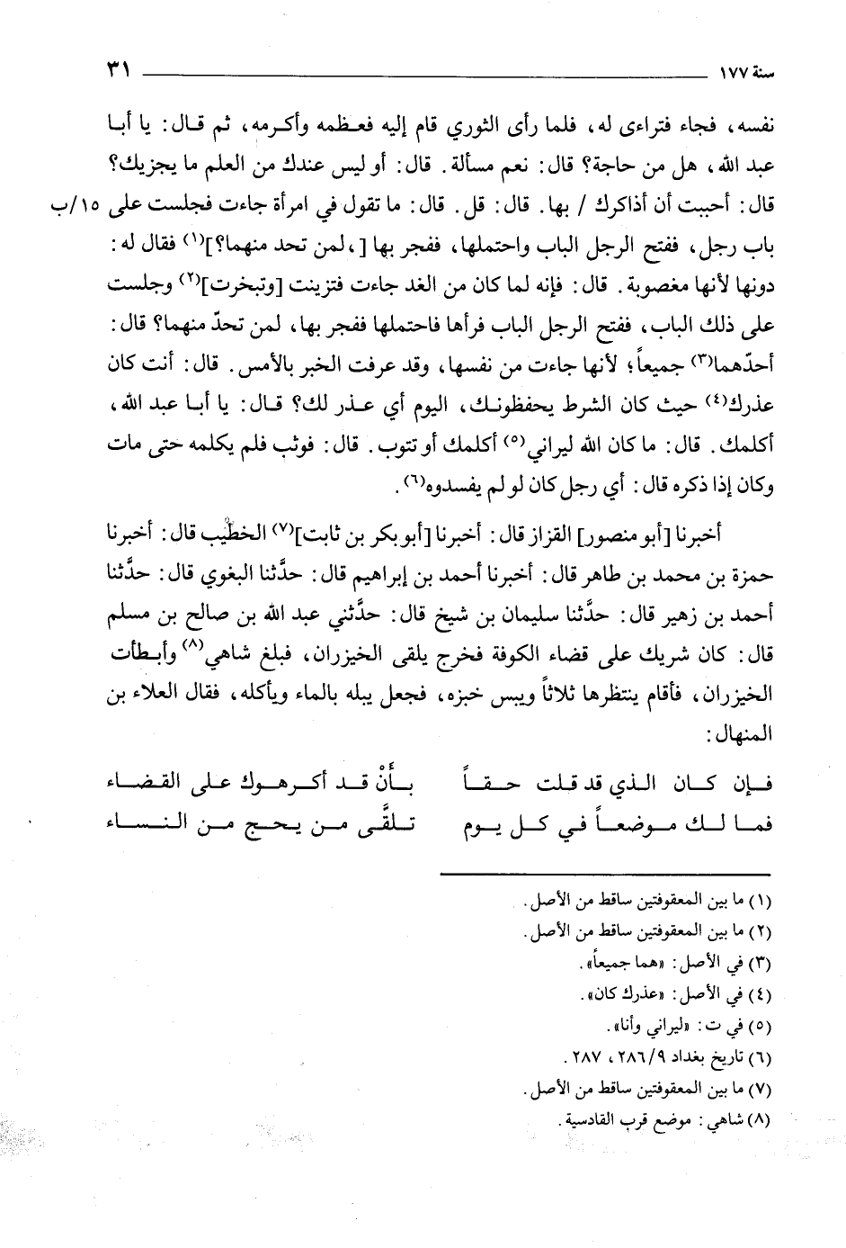 أخبرنا [أبو منصور] القزاز قال: أخبرنا [أبو بكر بن ثابت] [7] الخطيب قَالَ: أخبرنا حمزة بن مُحَمَّد بن طاهر قَالَ: أخبرنا أحمد بن إبْرَاهِيم قال: حدثنا البغوي قَالَ: حدثنا أحمد بن زهير قال: حدّثنا سليمان بن شيخ قال: حدثني عبد الله بن صالح بن مسلم قَالَ: كان شريك على قضاء الكوفة فخرج يلقى الخيزران، فبلغ شاهي [8] وأبطأت الخيزران، فأقام ينتظرها ثلاثا ويبس خبزه، فجعل يبله بالماء ويأكله، فقال العلاء بن المنهال: