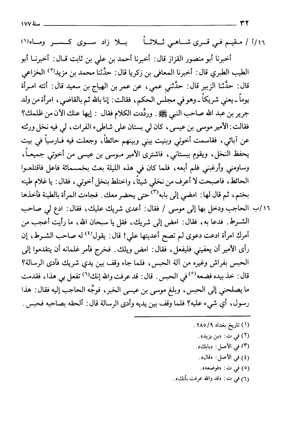فقالت: الأمير موسى بن عيسى، كَانَ لي بستان على شاطئ الفرات، لي فيه نخل ورثته عن آبائي، فقاسمت أخوتي وبنيت بيني وبينهم حائطا، وجعلت فيه فارسيا في بيت يحفظ النخل، ويقوم ببستاني، فاشترى الأمير موسى بن عيسى من أخوتي جميعا، وساومني وأرغبني فلم أبعه، فلما كان في هذه الليلة بعث بخمسمائة فاعل فاقتلعوا الحائط، فأصبحت لا أعرف من نخلي شيئا، واختلط بنخل أخوتي، فَقَالَ: يا غلام طينه بختم، ثم قال لها: امضي إلى بابه [3] حتى يحضر معك. فجاءت المرأة بالطينة فأخذها الحاجب ودخل بها إلى مُوسَى/ فَقَالَ: أعدى شريك عليك، فَقَالَ: ادع لي صاحب الشرط. فدعا بِهِ، فَقَالَ: امض إلى شَرِيك، فقل يا سبحان الله، ما رأيت أعجب من أمرك امرأة ادعت دعوى لم تصح أعديتها عليّ! قَالَ: يقول [4] له صاحب الشرط، إن رأى الأمير أن يعفيني فليفعل، فَقَالَ: امض ويلك. فخرج فأمر غلمانه أن يتقدموا إلى الحبس بفراش وغيره من آلة الحبس، فلما جاء وقف بين يدي شَرِيك فأدى الرسالة؟