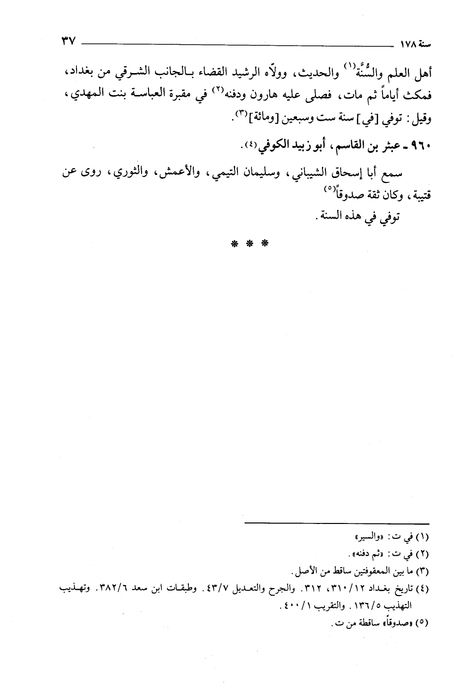 [4] تاريخ بغداد 12/ 310، 312. والجرح والتعديل 7/ 43. وطبقات ابن سعد 6/ 382. وتهذيب التهذيب 5/ 136. والتقريب 1/ 400.