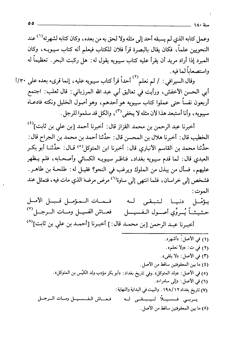حدثنا محمد بن القاسم الأنباري قَالَ: أخبرنا ابن المتوكل [5] قَالَ: حدثنا أبو بكر العبدي قَالَ: لما قدم سيبويه بغداد، فناظر سيبويه الكسائي وأصحابه، فلم يظهر عليهم، فسأل من يبذل من الملوك ويرغب في النَّحْو؟ فقيل لَهُ: طلحة بن طاهر.
