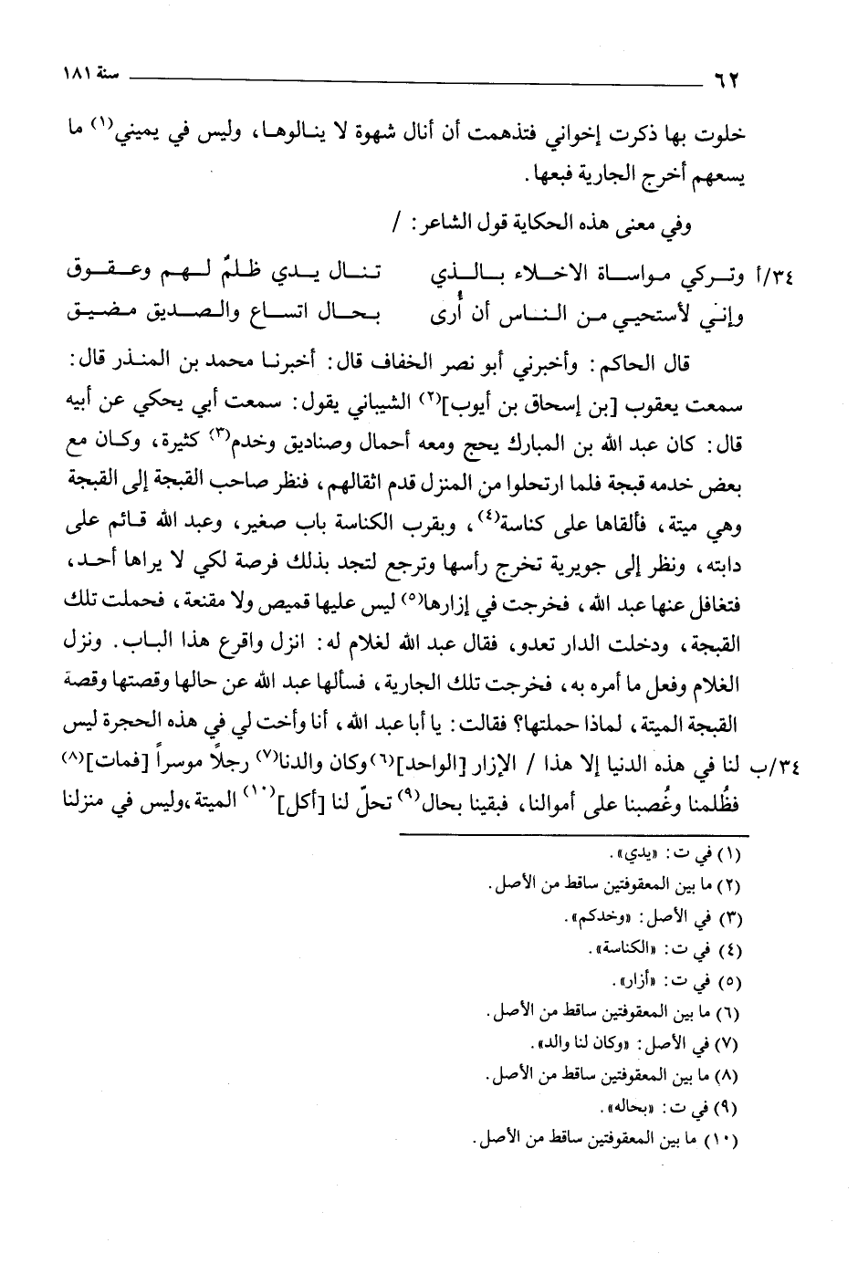 سمعت يعقوب [بْن إسحاق بن أيوب] [2] الشيباني يقول: سمعت أبي يحكي عن أَبِيهِ قَالَ: كان عبد الله بن المبارك يحج ومعه أحمال وصناديق وخدم [3] كثيرة، وكان مع بعض خدمه قبجة فلما ارتحلوا من المنزل قدم أثقالهم، فنظر صاحب القبجة إلى القبجة وهي ميتة، فألقاها على كناسة [4] ، وبقرب الكناسة باب صغير، وعبد الله قائم على دابته، ونظر إلى جويرية تخرج رأسها وترجع لتجد بذلك فرصة لكي لا يراها أحد، فتغافل عنها عبد اللَّه، فخرجت في إزارها [5] ليس عليها قميص ولا مقنعة، فحملت تلك القبجة، ودخلت الدار تعدو، فقال عبد اللَّه لغلام لَهُ: انزل واقرع هذا الباب. ونزل الغلام وفعل ما أمره بِهِ، فخرجت تلك الجارية، فسألها عبد الله عن حالها وقصتها وقصة القبجة الميتة، لماذا حملتها؟ فقالت: يا أبا عبد الله، أنا وأخت لي في هذه الحجرة ليس لنا في هذه الدنيا إلا هذا/ الإزار [الواحد] [6] وكان والدنا [7] رجلا موسرا [فمات] [8] فظلمنا وغصبنا على أموالنا، فبقينا بحال [9] تحل لنا [أكل] [10] الميتة، وليس في منزلنا