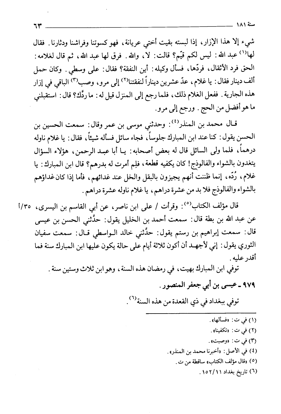 قال مؤلف الكتاب [5] : وقرأت/ على ابن ناصر، عن أبي القاسم بن اليسرى، عن عبد الله بن بطة قَالَ: سمعت أحمد بن الخليل يَقُولُ: حدثني الحسن بن عيسى قَالَ: سمعت إبراهيم بن رستم يَقُولُ: حدثني خالد الواسطي قَالَ: سمعت سفيان الثَّورِي يَقُولُ: إني لأجهد أن أكون ثلاثة أيام عَلَى حالة يكون عليها ابن المبارك سنة فما أقدر عليّه.