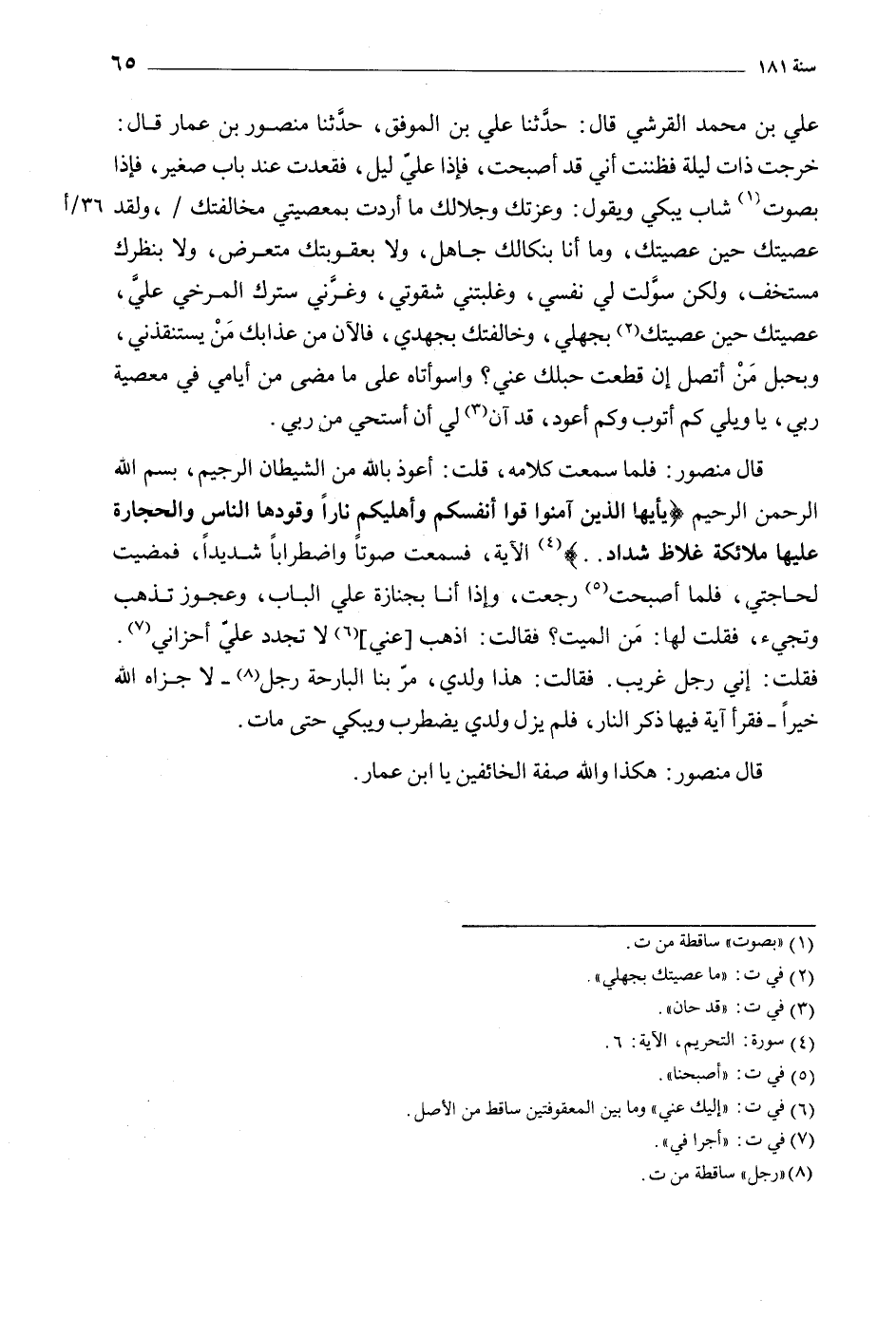 قال منصور: فلما سمعت كلامه، قُلْتُ: أعوذ باللَّه من الشيطان الرجيم، بسم اللَّه الرَّحْمَن الرحيم يا أَيُّهَا الَّذِينَ آمَنُوا قُوا أَنْفُسَكُمْ وَأَهْلِيكُمْ نَارًا وَقُودُهَا النَّاسُ وَالْحِجارَةُ عَلَيْها مَلائِكَةٌ غِلاظٌ شِدادٌ.. 66: 6 [4] الآية، فسمعت صوتا واضطرابا شديدا، فمضيت لحاجتي، فلما أصبحت [5] رجعت، وإذا أنا بجنازة علي الباب، وعجوز تذهب.