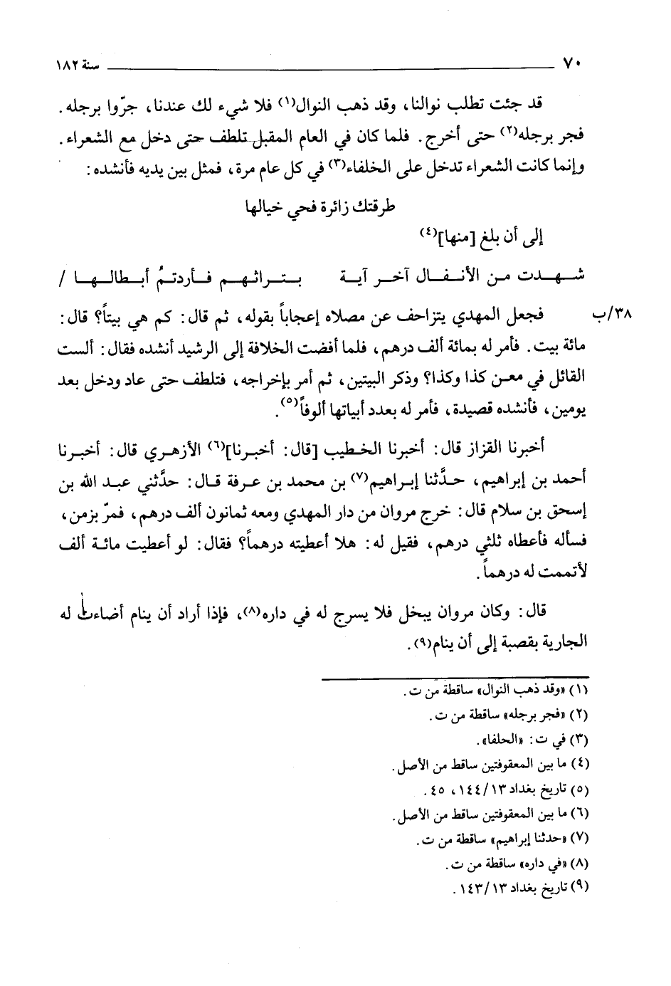 أَخْبَرَنَا الْقَزَّازُ قَالَ: أَخْبَرَنَا الخطيب [قَالَ: أَخْبَرَنَا] [6] الأزهري قَالَ: أخبرنا أَحْمَد بْن إبراهيم، حَدَّثَنَا إبراهيم [7] بْن مُحَمَّد بن عرفة قَالَ: حدثني عبد الله بن إِسْحَاق بن سلام قَالَ: خرج مروان من دار المهدي ومعه ثمانون ألف درهم، فمر بزمن، فسأله فأعطاه ثلثي درهم، فقيل لَهُ: هلا أعطيته درهما؟ فَقَالَ: لو أعطيت مائة ألف لأتممت له درهما.