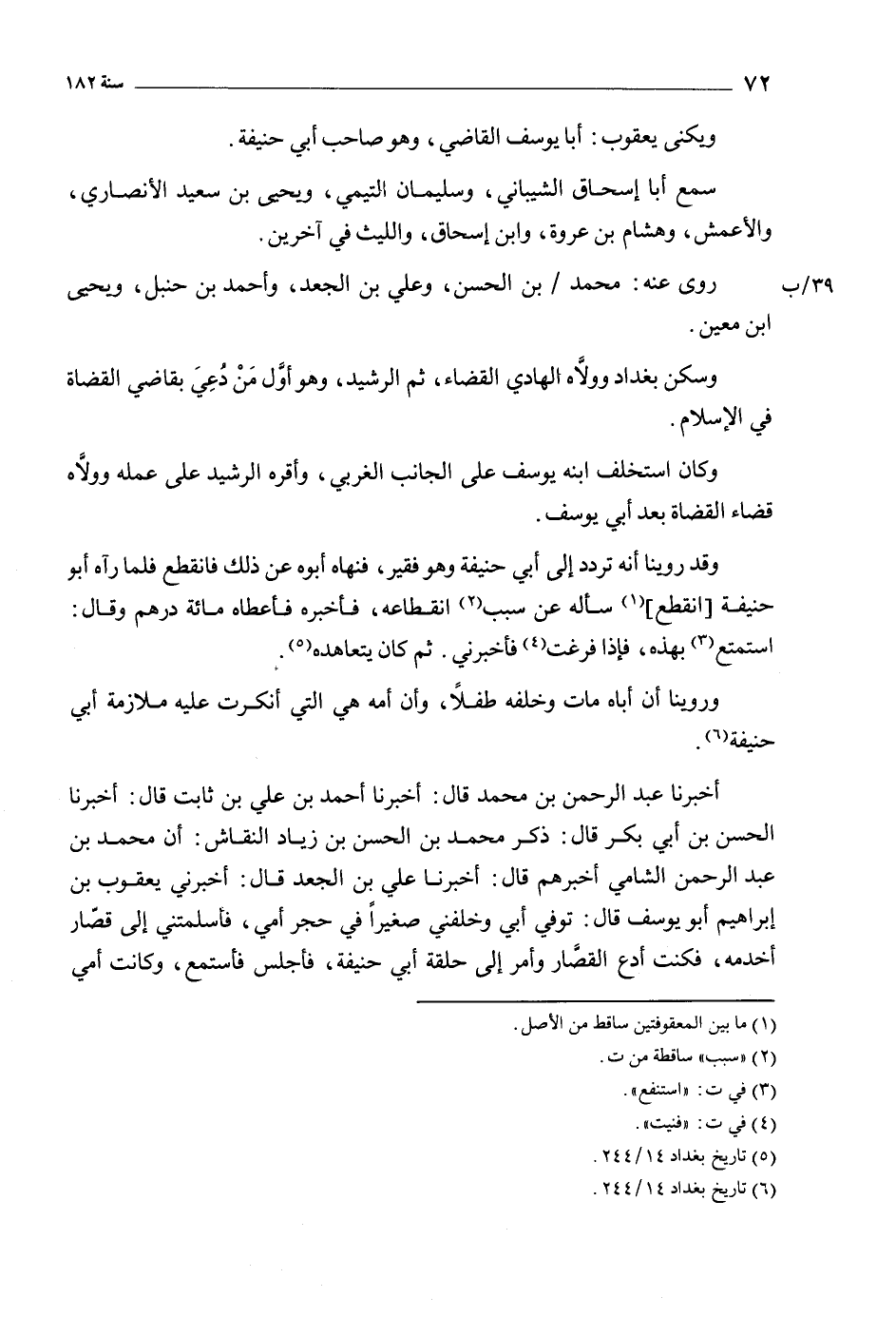 أخبرنا عبد الرحمن بن محمد قال: أخبرنا أحمد بن علي بن ثابت قال: أخبرنا الحسن بن أبي بَكْر قَالَ: ذكر محمد بن الحسن بن زياد النقاش: أن محمد بْن عَبْد الرَّحْمَن الشامي أخبرهم قَالَ: أخبرنا علي بن الجعد قَالَ: أخبرني يعقوب بن إبراهيم أبو يوسف قَالَ: توفي أبي وخلفني صغيرا في حجر أمي، فأسلمتني إلى قصار أخدمه، فكنت أدع القصّار وأمر إلى حلقة أبي حنيفة، فأجلس فأستمع، وكانت أمي