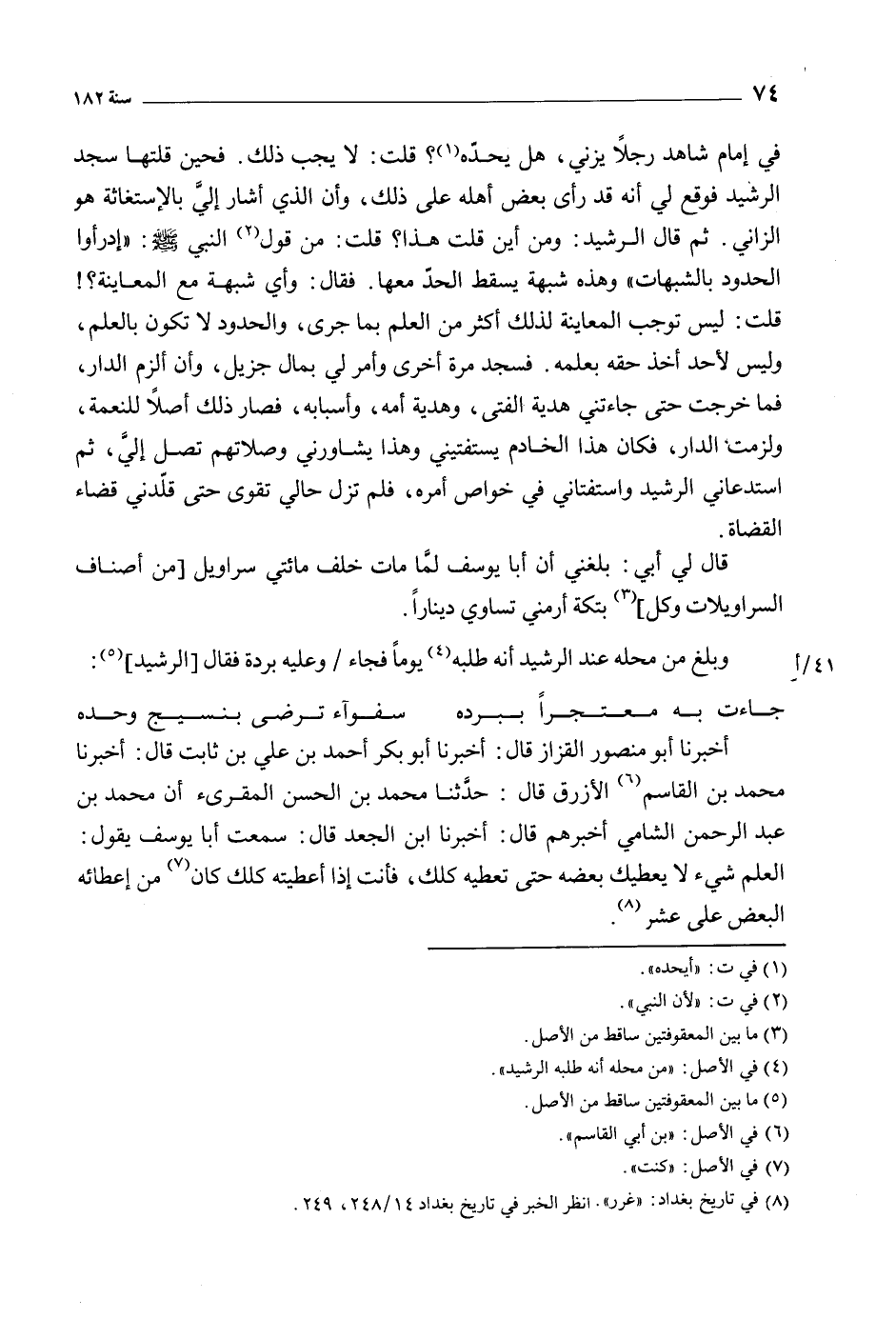 فِي إِمَام شَاهَدَ رَجُلا يَزْنِي، هَلْ يَحُدُّهُ [1] ؟ قُلْتُ: لا يَجِبُ ذَلِكَ. فَحِينَ قُلْتُهَا سَجَدَ الرشيد فوقع لي أنه قد رَأَى بَعْضَ أَهْلِهِ عَلَى ذَلِكَ، وَأَنَّ الَّذِي أَشَارَ إِلَيَّ بِالاسْتِغَاثَةِ هُوَ الزَّانِي. ثُمَّ قَالَ الرَّشِيدُ: وَمِنْ أَيْنَ قُلْتَ هَذَا؟ قُلْتُ: مِنْ قول [2] النبي صلَّى اللَّه عَلَيْهِ وَسَلَّمَ: «ادْرَءُوا الْحُدُودَ بِالشُّبُهَاتِ» وَهَذِهِ شُبْهَةٌ يَسْقُطُ الْحَدُّ مَعَهَا. فَقَالَ: وَأَيُّ شُبْهَةٍ مَعَ الْمُعَايَنَةِ؟! قُلْتُ: لَيْسَ تُوجِبُ الْمُعَايِنَةُ لِذَلِكَ أَكْثَرَ مِنَ الْعِلْمِ بِمَا جَرَى، وَالْحُدُودُ لا تَكُونُ بِالْعِلْمِ، وَلَيْسَ لأَحَدٍ أَخْذُ حَقِّهِ بِعِلْمِهِ. فَسَجَدَ مَرَّةً أُخْرَى وَأَمَرَ لِي بِمَالٍ جزيل، وأن أَلْزَمَ الدَّارَ، فَمَا خَرَجْتُ حَتَّى جَاءَتْنِي هَدِيَّةُ الْفَتَى، وَهَدِيَّةُ أُمِّهِ، وَأَسْبَابُهُ، فَصَارَ ذَلِكَ أَصْلا لِلنِّعْمَةِ، وَلَزِمْتُ الدَّارَ، فَكَانَ هَذَا الْخَادِمُ يَسْتَفْتِينِي وَهَذَا يُشَاوِرُنِي وَصِلاتُهُمْ تَصِلُ إِلَيَّ، ثُمَّ اسْتَدْعَانِي الرَّشِيدُ وَاسْتَفْتَانِي فِي خَوَاصِّ أَمْرِهِ، فَلَمْ تَزَلْ حَالِي تَقْوَى حَتَّى قَلَّدَنِيَ قَضَاءَ الْقُضَاةِ.