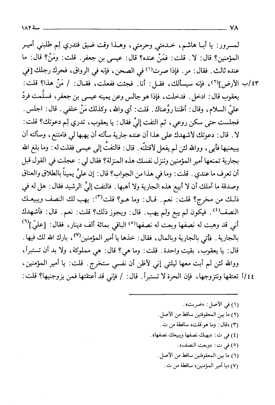 قال: يا يعقوب، بقيت واحدة. قُلْتُ: وما هي؟ قَالَ: هي مملوكة، ولا بد أن تستبرأ، وو الله لئن لم أبت معها ليلتي إني لأظن أن نفسي ستخرج. قُلْتُ: يا أمير المؤمنين، تعتقها وتتزوجها، فإن الحرة لا تستبرأ. قَالَ: / فإني قد أعتقتها فمن يزوجنيها؟ قلت:
