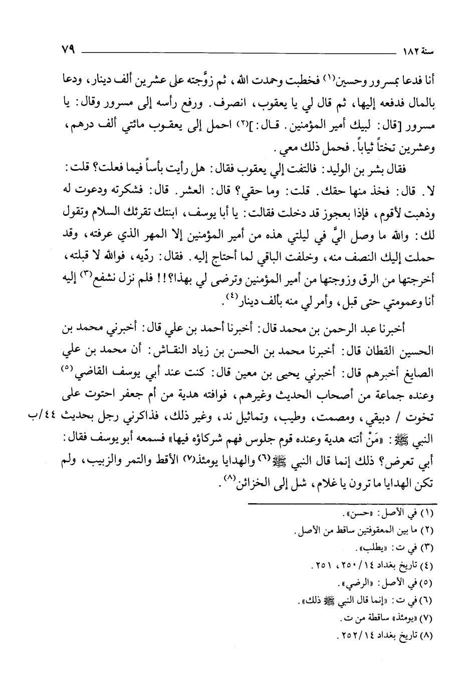 أَخْبَرَنَا عَبْدُ الرَّحْمَنِ بن مُحَمَّد قَالَ: أخبرنا أحمد بن علي قال: أخبرني محمد بن الحسين القطان قَالَ: أَخْبَرَنَا مُحَمَّدُ بْنُ الْحَسَنِ بْنِ زِيَادٍ النَّقَّاشُ: أَنَّ مُحَمَّدَ بْنَ عَلِيٍّ الصَّايغَ أَخْبَرَهُمْ قَالَ: أَخْبَرَنِي يَحْيَى بْنُ مَعِينٍ قَالَ: كُنْتُ عِنْدَ أَبِي يُوسُفَ الْقَاضِي [5] وَعِنْدَهُ جَمَاعَةٌ مِنْ أَصْحَابِ الْحَدِيثِ وَغَيْرِهِمْ، فَوَافَتْهُ هَدِيَّةٌ مِنْ أُمِّ جَعْفَرٍ احْتَوَتْ عَلَى تُخُوت/ دَبِيقِيٍّ، وَمُصْمَتٍ، وَطِيبٍ، وَتَمَاثِيلَ نِدٍّ، وَغَيْرَ ذَلِكَ، فَذَاكَرَنِي رَجُلٌ بِحَدِيثِ النَّبيِّ صَلَّى اللَّهُ عَليْه وَسَلَّمَ: «مَنْ أَتَتْهُ هَدِيَّةٌ وَعِنْدَهُ قَوْمٌ جُلُوسٌ فَهُمْ شُرَكَاؤُهُ فِيهَا» فَسَمِعَهُ أَبُو يُوسُفَ فَقَالَ: