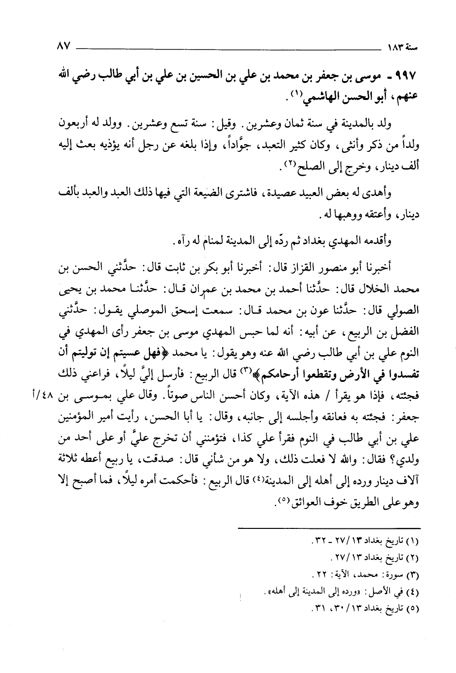 997- موسى بن جعفر بن محمد بن علي بن الحسين بن علي بن أبي طالب رضي الله عَنْهُمْ، أبو الحسن الهاشمي