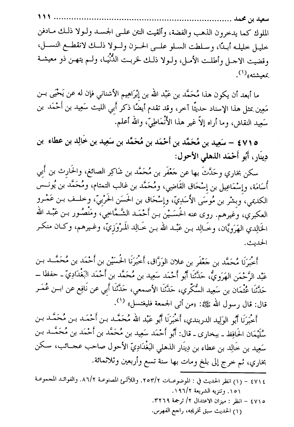 4715- سعيد بْن مُحَمَّد بْن أَحْمَد بْن مُحَمَّد بْن سعيد بن خالد بن عطاء بن دينار، أبو أحمد الذهلي الأحول [2] :