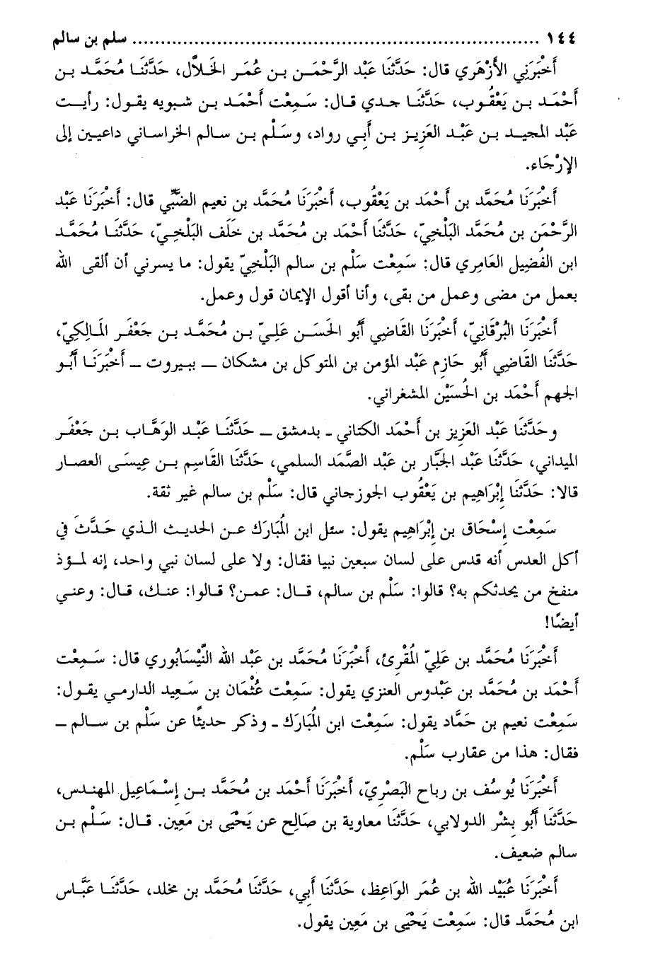 وحَدَّثَنَا عَبْدُ الْعَزِيزِ بْنُ أَحْمَدَ الْكَتَّانِيُّ- بِدِمَشْقَ- حدّثنا عبد الوهّاب بن جعفر الميداني، حَدَّثَنَا عبد الجبار بن عبد الصمد السلمي، حَدَّثَنَا القاسم بن عيسى العصار قالا: حَدَّثَنَا إبراهيم بن يعقوب الجوزجاني قال: سلم بن سالم غير ثقة.