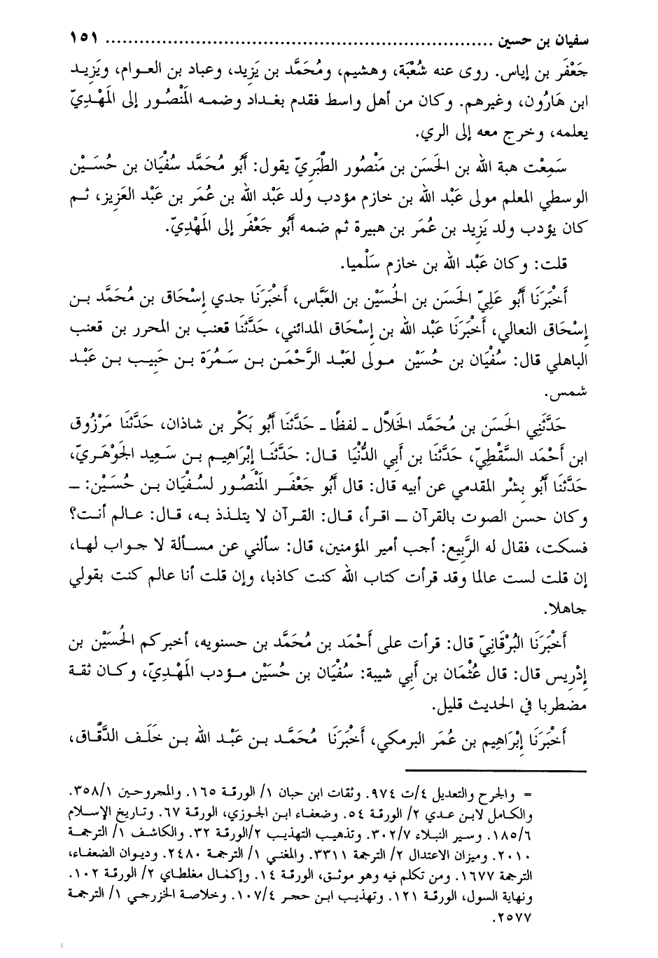 حَدَّثَنِي الحسن بن محمد الخلال- لفظا- حَدَّثَنَا أبو بكر بن شاذان، حدّثنا مرزوق ابن أحمد السّقطيّ، حدّثنا بن أبي الدنيا قال: حَدَّثَنَا إبراهيم بن سعيد الجوهريّ، حَدَّثَنَا أبو بشر المقدمي عن أبيه قال: قال أبو جعفر المنصور لسفيان بن حسين: - وكان حسن الصوت بالقرآن- اقرأ، قال: القرآن لا يتلذذ به، قال: عالم أنت؟