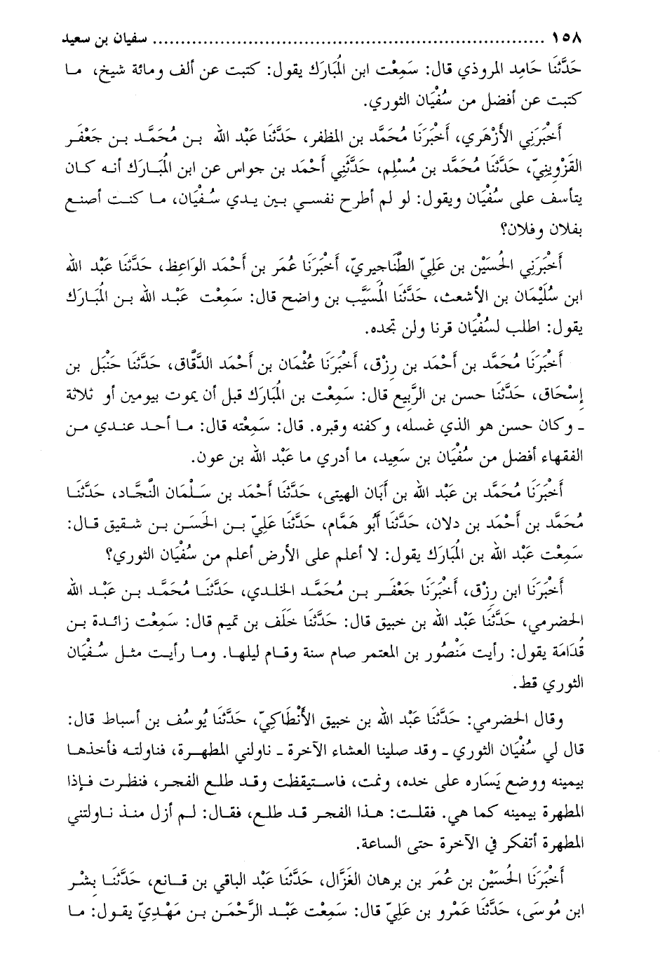 حدّثنا حامد المروذي قال: سمعت ابن المبارك يقول: كتبت عن ألف ومائة شيخ، ما كتبت عن أفضل من سفيان الثوري.