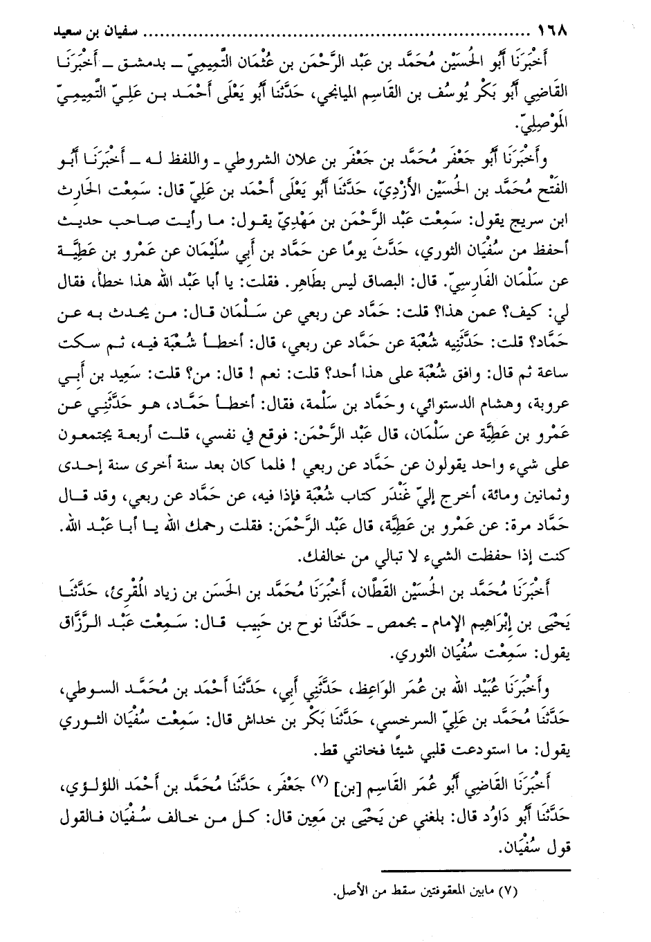 وَأَخْبَرَنَا أَبُو جَعْفَر مُحَمَّد بْن جَعْفَر بْن علان الشروطي- واللفظ له- أَخْبَرَنَا أبو الفتح محمد بن الحسين الأزدي، حَدَّثَنَا أَبُو يَعْلَى أَحْمَدُ بْنُ عَلِيٍّ قَالَ: سمعت الحارث ابن سُرَيْجٍ يَقُولُ: سَمِعْتُ عَبْدَ الرَّحْمَنِ بْنَ مَهْدِيٍّ يَقُولُ: مَا رَأَيْتُ صَاحِبَ حَدِيثٍ أَحْفَظَ مِنْ سُفْيَانَ الثَّوْرِيِّ، حَدَّثَ يَوْمًا عَنْ حَمَّادِ بْنِ أَبِي سُلَيْمَانَ عَنْ عَمْرِو بْنِ عَطِيَّةَ عَنْ سَلْمَانَ الْفَارِسِيِّ. قَالَ: الْبُصَاقُ لَيْسَ بِطَاهِرٍ. فَقُلْتُ: يَا أَبَا عَبْدِ اللَّهِ هَذَا خَطَأٌ، فَقَالَ لِي: كَيْفَ؟ عَمَّنْ هَذَا؟ قُلْتُ: حَمَّادٌ عَنْ رِبْعِيٍّ عَنْ سَلْمَانَ قَالَ: مَنْ يُحَدِّثُ بِهِ عَنْ حَمَّادٍ؟ قُلْتُ: حَدَّثَنِيهِ شُعْبَةُ عَنْ حَمَّادٍ عَنْ رِبْعِيٍّ، قَالَ: أَخْطَأَ شُعْبَةُ فِيهِ، ثُمَّ سَكَتَ سَاعَةً ثُمَّ قَالَ: وَافَقَ شُعْبَةَ عَلَى هَذَا أَحَدٌ؟ قُلْتُ: نَعَمْ! قَالَ: مَنْ؟ قُلْتُ: سَعِيدُ بْنُ أَبِي عَرُوبَةَ، وَهِشَامُ الدَّسْتُوَائِيُّ، وَحَمَّادُ بْنُ سَلَمَةَ، فَقَالَ: أَخْطَأَ حَمَّادٌ، هُوَ حَدَّثَنِي عَنْ عَمْرِو بْنِ عَطِيَّةَ عَنْ سَلْمَانَ، قَالَ عَبْدُ الرَّحْمَنِ: فَوَقَعَ فِي نَفْسِي، قُلْتُ أَرْبَعَةٌ يَجْتَمِعُونَ عَلَى شَيْءٍ وَاحِدٍ يَقُولُونَ عَنْ حَمَّادٍ عَنْ رِبْعِيٍّ! فَلَمَّا كَانَ بَعْدَ سَنَةٍ أُخْرَى سَنَةَ إِحْدَى وَثَمَانِينَ وَمِائَةٍ، أَخْرَجَ إِلَيَّ غُنْدَرٌ كِتَابَ شُعْبَةَ فَإِذَا فِيهِ، عَنْ حَمَّادٍ عَنْ رِبْعِيٍّ، وَقَدْ قَالَ حَمَّادٌ مَرَّةً: عَنْ عَمْرِو بْنِ عَطِيَّةَ، قَالَ عَبْدُ الرَّحْمَنِ: فَقُلْتُ رَحِمَكَ اللَّهُ يَا أَبَا عَبْدِ اللَّهِ.