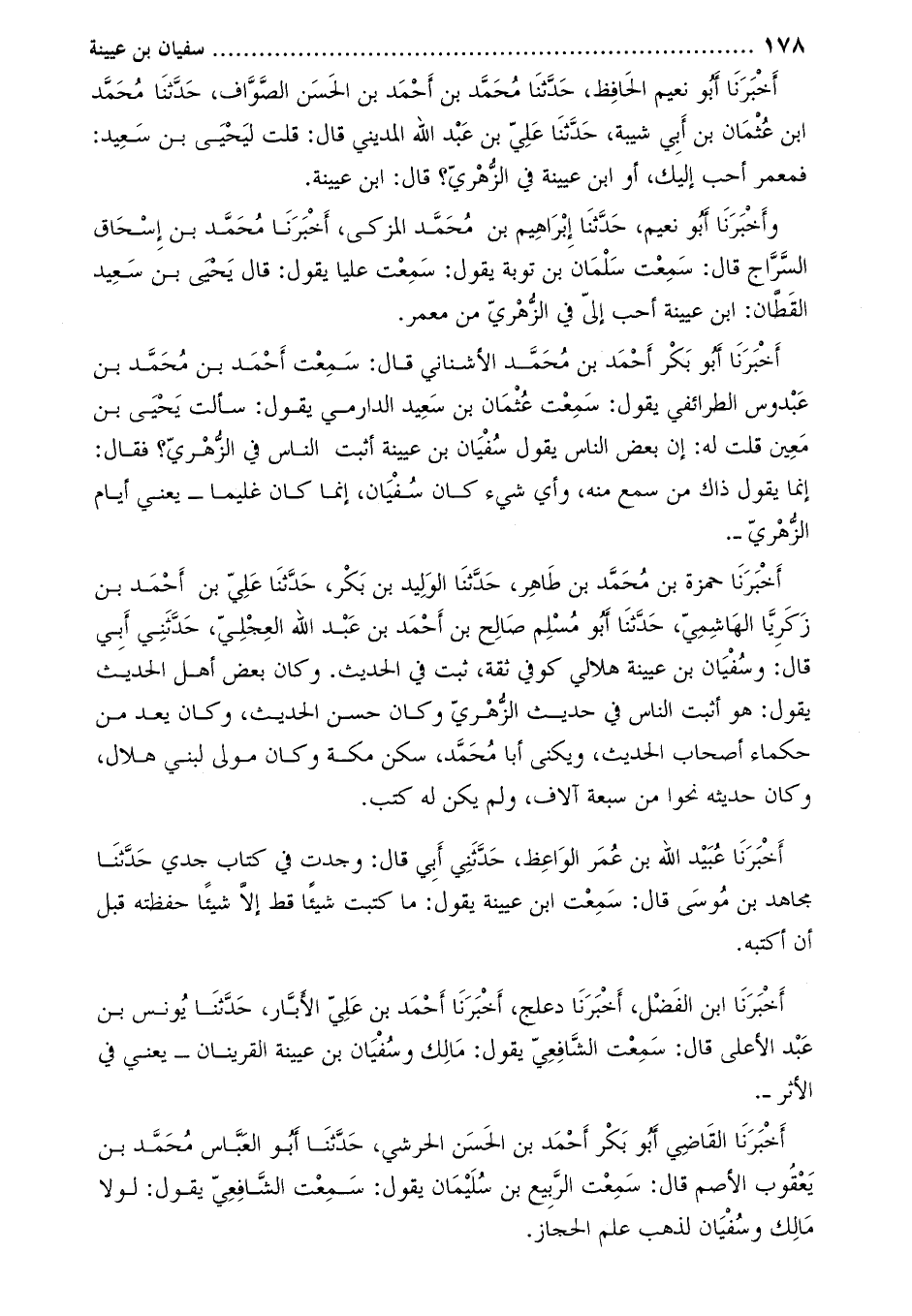 أَخْبَرَنَا حمزة بن محمد بن طاهر، حدّثنا الوليد بن بكر، حدثنا علي بن أحمد بن زكريا الهاشمي، حدثنا أبو مسلم صالح بن أحمد بن عبد الله العجليّ، حَدَّثَنِي أبي قال: وسفيان بن عيينة هلالي كوفي ثقة، ثبت في الحديث. وكان بعض أهل الحديث يقول: هو أثبت الناس في حديث الزهري وكان حسن الحديث، وكان يعد من حكماء أصحاب الحديث، ويكنى أبا محمد، سكن مكة وكان مولى لبني هلال، وكان حديثه نحوا من سبعة آلاف، ولم يكن له كتب.