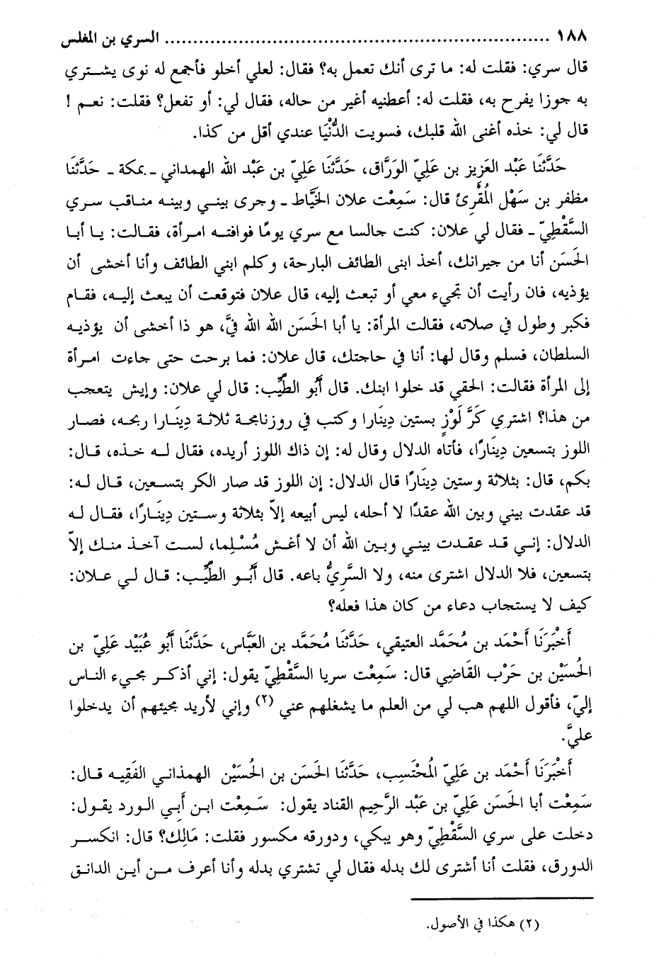 أَخْبَرَنَا أحمد بن محمد العتيقي، حدّثنا محمّد بن العبّاس، حَدَّثَنَا أَبُو عُبَيْدٍ عَلِيُّ بْنُ الْحُسَيْنِ بْنِ حَرْبٍ القاضي قال: سمعت سريا السقطي يقول: إني أذكر مجيء الناس إلي، فأقول اللهم هب لي من العلم ما يشغلهم عني [1] وإني لأريد مجيئهم أن يدخلوا علي.