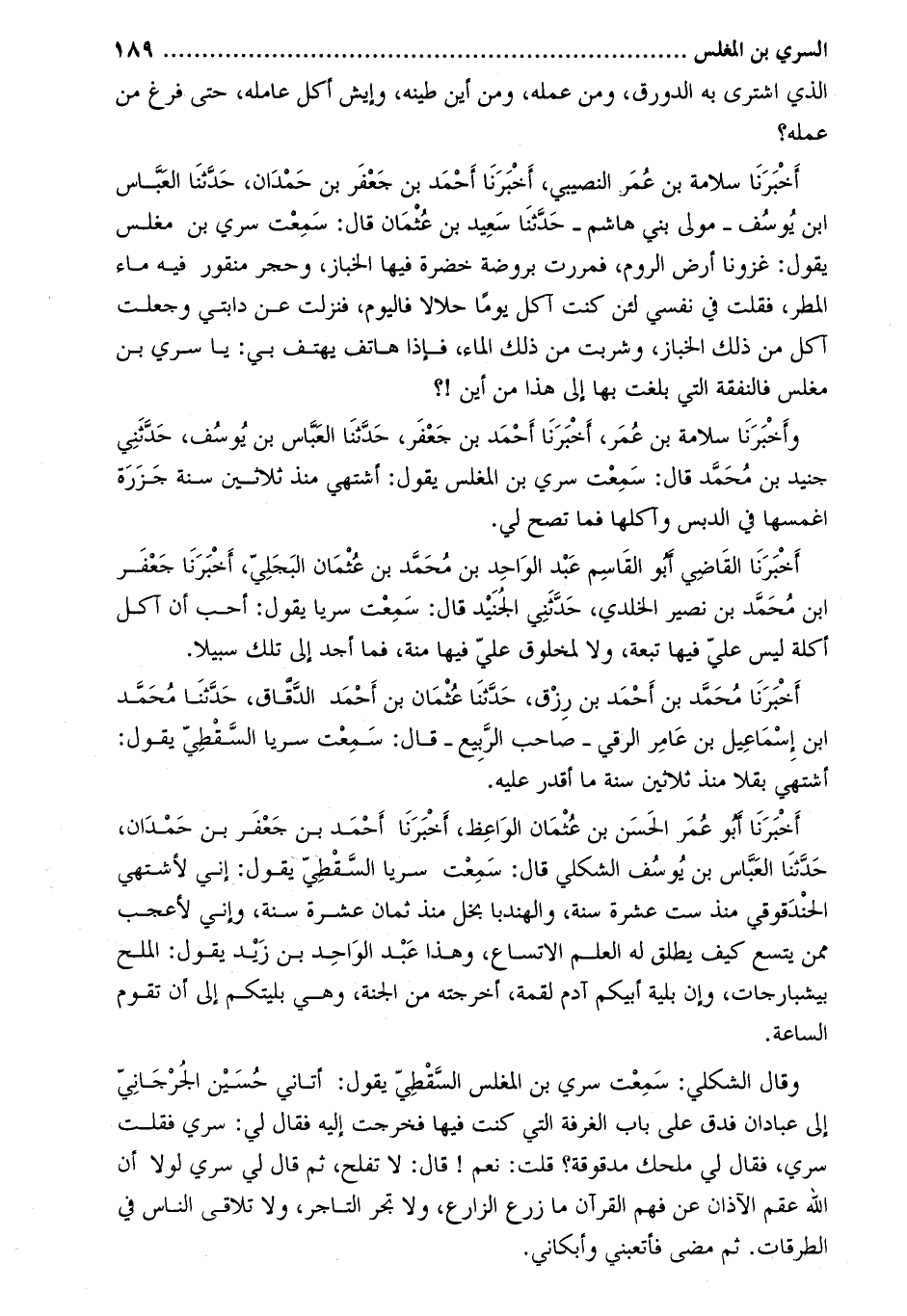 أَخْبَرَنَا الْقَاضِي أَبُو الْقَاسِمِ عَبْدُ الْوَاحِدِ بْنُ محمد بن عثمان البجلي، أخبرنا جعفر ابن محمّد بن نصير الخلدي، حَدَّثَنِي الجنيد قال: سمعت سريا يقول: أحب أن آكل أكلة ليس علي فيها تبعة، ولا لمخلوق علي فيها منة، فما أجد إلى تلك سبيلا.