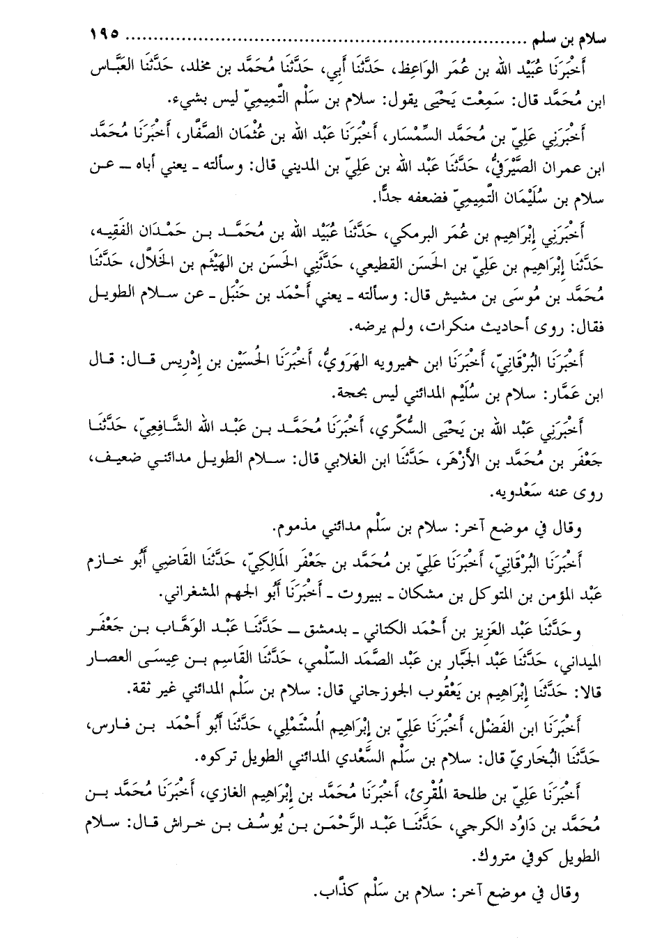 وحَدَّثَنَا عَبْدُ الْعَزِيزِ بْنُ أَحْمَدَ الْكَتَّانِيُّ- بِدِمَشْقَ- حدّثنا عبد الوهّاب بن جعفر الميداني، حَدَّثَنَا عبد الجبار بن عبد الصمد السلمي، حَدَّثَنَا القاسم بن عيسى العصار قالا: حَدَّثَنَا إبراهيم بن يعقوب الجوزجاني قال: سلام بن سلم المدائني غير ثقة.
