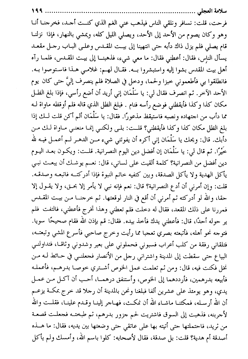 فَانْطَلَقُوا بِي فَأَطْعَمُونِي خُبْزًا وَلَحْمًا، وَدَخَلَ فِي الصَّلاةِ فَلَمْ يَنْصَرِفْ إِلَيَّ حَتَّى كَانَ يَوْمُ الأَحَدِ الآخَرِ. ثُمَّ انْصَرَفَ فَقَالَ لِي: يَا سَلْمَانُ إِنِّي أُرِيدُ أَنْ أَضَعَ رَأْسِي، فَإِذَا بَلَغ الظِّلُّ مَكَانَ كَذَا وَكَذَا فَأَيْقِظْنِي فَوَضَعَ رَأْسَهُ فَنَامَ. فَبَلَغَ الظِّلُّ الَّذِي قَالَهُ فَلَمْ أُوقِظْهُ مَأْوَاةً لَهُ مِمَّا دَأَبَ مِنَ اجْتِهَادِهِ وَنَصَبِهِ فَاسْتَيْقَظَ مَذْعُورًا. فَقَالَ: يَا سَلْمَانُ أَلَمْ أَكُنْ قُلْتُ لَكَ إِذَا بَلَغَ الظِّلُّ مَكَانَ كَذَا وَكَذَا فَأَيْقِظْنِي؟ قُلْتُ: بَلَى وَلَكِنِّي إِنَّمَا مَنَعَنِي مَأْوَاةٌ لَكَ مِنْ دَأْبِكَ. قَالَ: وَيْحَكَ يَا سَلْمَانُ إِنِّي أَكْرَهُ أَنْ يَفُوتَنِي شَيْءٌ مِنَ الدَّهْرِ لَمْ أَعْمَلْ فِيهِ لِلَّهِ خَيْرًا. ثُمَّ قَالَ لِي: يَا سَلْمَانُ إِنَّ أَفْضَلَ دِينِ الْيَوْمِ النَّصْرَانِيَّةُ. قُلْتُ: وَيَكُونُ بَعْدَ الْيَوْمِ دِينٌ أَفْضَلُ مِنَ النَّصْرَانِيَّةِ؟ كَلِمَةٌ أُلْقِيَتْ عَلَى لِسَانِي، قَالَ: نَعَمْ يُوشِكُ أَنْ يُبْعَثَ نَبِيٌّ يَأْكُلُ الْهَدِيَّةَ وَلا يَأْكُلُ الصَّدَقَةَ، وَبَيْنَ كَتِفَيْهِ خَاتَمُ النُّبُوَّةِ فَإِذَا أَدْرَكْتَهُ فَاتَّبِعْهُ وَصَدِّقْهُ.