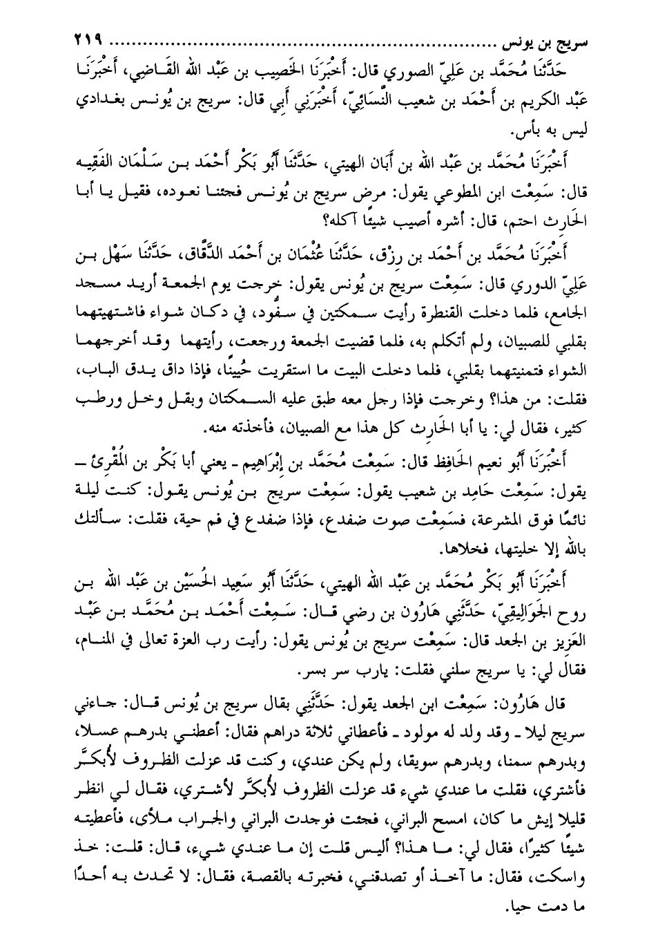 أَخْبَرَنَا أبو بكر محمد بن عبد الله الهيتي، حَدَّثَنَا أبو سعيد الحسين بن عبد الله بن روح الجواليقيّ، حَدَّثَنِي هارون بن رضي قَالَ: سمعت أَحْمَد بْن مُحَمَّد بْن عَبْد العزيز بْن الجعد قال: سمعت سريج بن يونس يقول: رأيت رب العزة تعالى في المنام، فقال لي: يا سريج سلني فقلت: يا رب سر بسر.