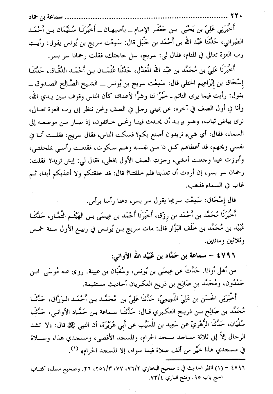 أَخْبَرَنِي الْحَسَنُ بْنُ عَلِيٍّ التَّمِيمِيُّ، حَدَّثَنَا عَلِيُّ بْنُ مُحَمَّدِ بْنِ أَحْمَدَ الْوَرَّاقُ، حَدَّثَنَا مُحَمَّدُ بْنُ صَالِحِ بْنِ ذَرِيحٍ الْعُكْبَرِيُّ قال: حدّثنا سماعة بن حمّاد الأواني، حدّثنا سفيان، حَدَّثَنَا الزُّهْرِيِّ عَنْ سَعِيدِ بْنِ الْمُسَيِّبِ عَنْ أَبِي هُرَيْرَةَ، أَنَّ النَّبِيَّ صَلَّى اللَّهُ عَلَيْهِ وَسَلَّمَ قَالَ: «لا تُشَدُّ الرِّحَالُ إِلا إِلَى ثَلاثَةِ مَسَاجِدَ مَسْجِدُ الْحَرَامِ، وَالْمَسْجِدُ الأَقْصَى، وَمَسْجِدِي هَذَا، وَصَلاةٌ فِي مَسْجِدِي هَذَا خَيْرٌ مِنْ أَلْفِ صَلاةٍ فِيمَا سِوَاهُ، إِلا الْمَسْجِدَ الْحَرَامَ» [1] .