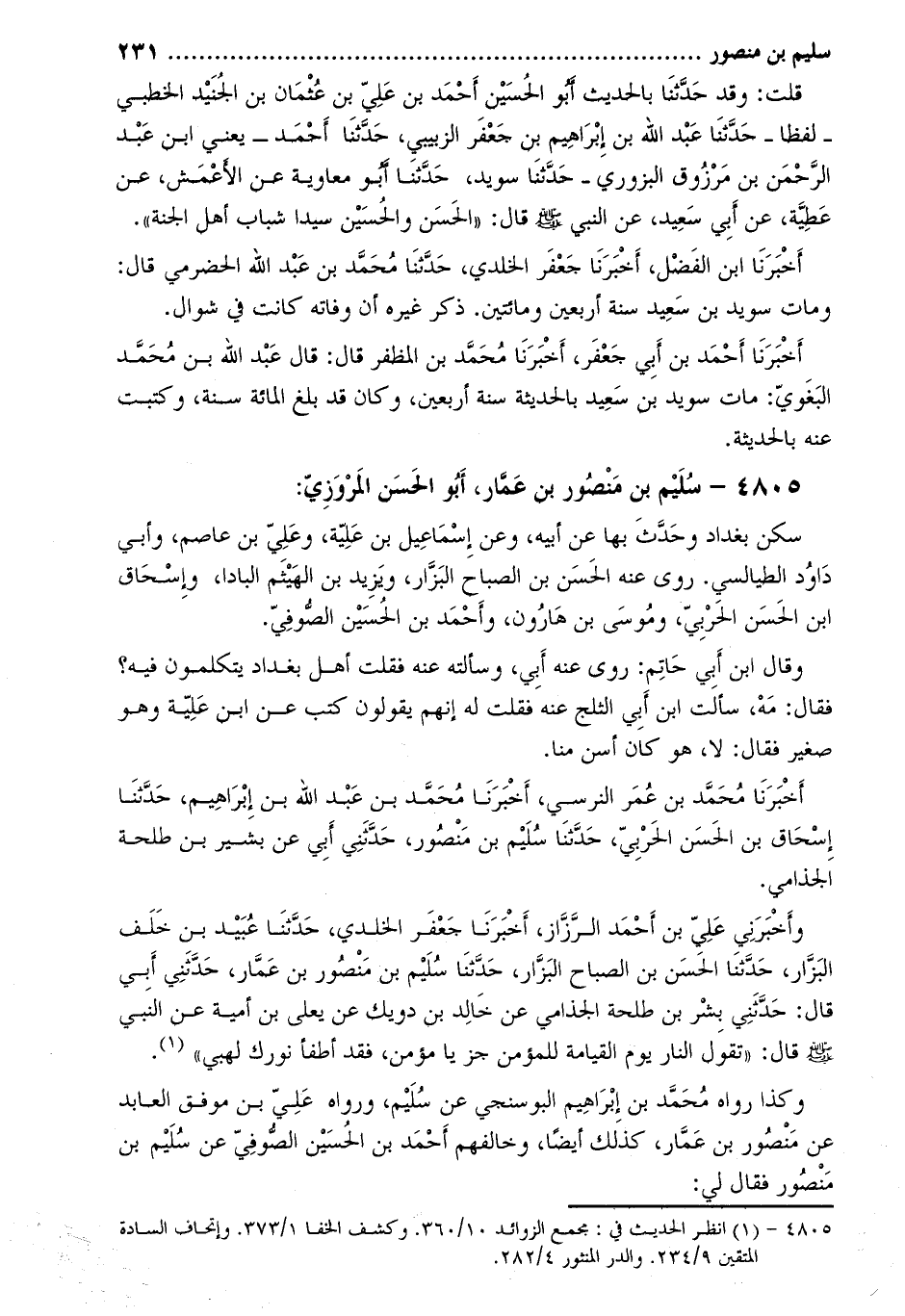 وأخبرني عليّ بن أحمد الرّزّاز، أخبرنا جعفر الخلدي، حدّثنا عبيد بن خلف البزّار، حدّثنا الحسن بن الصباح البزّار، حدّثنا سليم بن منصور بن عمّار، حدّثني أبي قال: حدّثني بشر بن طلحة الجذامي عن خالد بن دويك عن يعلى بن أمية عَنِ النَّبِيِّ صَلَّى اللَّهُ عَلَيْهِ وَسَلَّمَ قَالَ: «تَقُولُ النَّارُ يَوْمَ الْقِيَامَةِ لِلْمُؤْمِنِ جُزْ يَا مُؤْمِنُ، فَقَدْ أَطْفَأَ نُورُكَ لَهَبِي» [1]