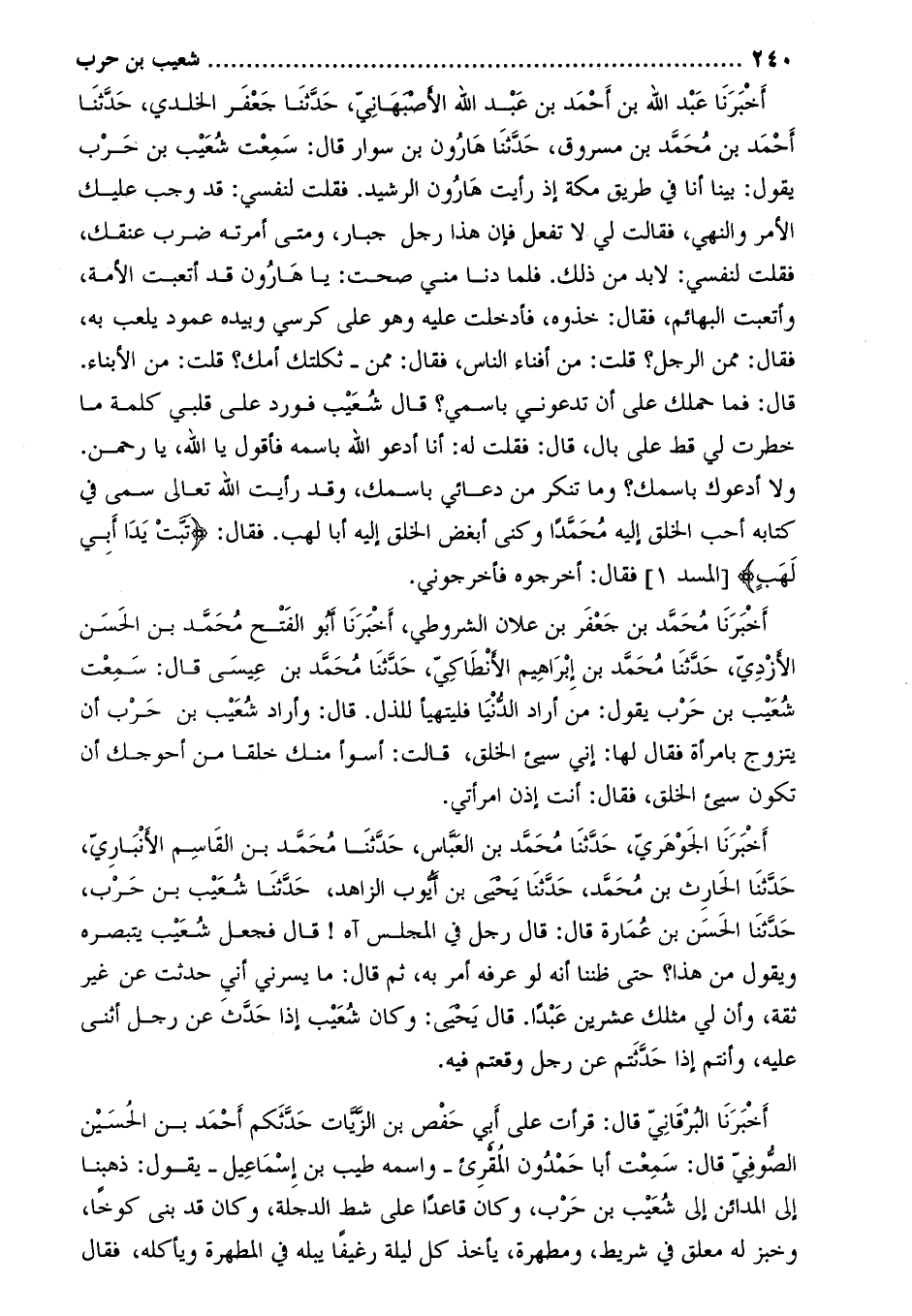 أَخْبَرَنَا عَبْدُ اللَّهِ بْنُ أَحْمَدَ بْنِ عَبْدِ اللَّهِ الأصبهانيّ، حدّثنا جعفر الخلدي، حدّثنا أحمد بن محمّد بن مسروق، حَدَّثَنَا هارون بن سوار قال: سمعت شعيب بن حرب يقول: بينا أنا في طريق مكة إذ رأيت هارون الرشيد. فقلت لنفسي: قد وجب عليك الأمر والنهي، فقالت لي لا تفعل فإن هذا رجل جبار، ومتى أمرته ضرب عنقك، فقلت لنفسي: لا بد من ذلك. فلما دنا مني صحت: يا هارون قد أتعبت الأمة، وأتعبت البهائم، فقال: خذوه، فأدخلت عليه وهو على كرسي وبيده عمود يلعب به، فقال: ممن الرجل؟ قلت: من أفناء الناس، فقال: ممن- ثكلتك أمك؟ قلت: من الأبناء.